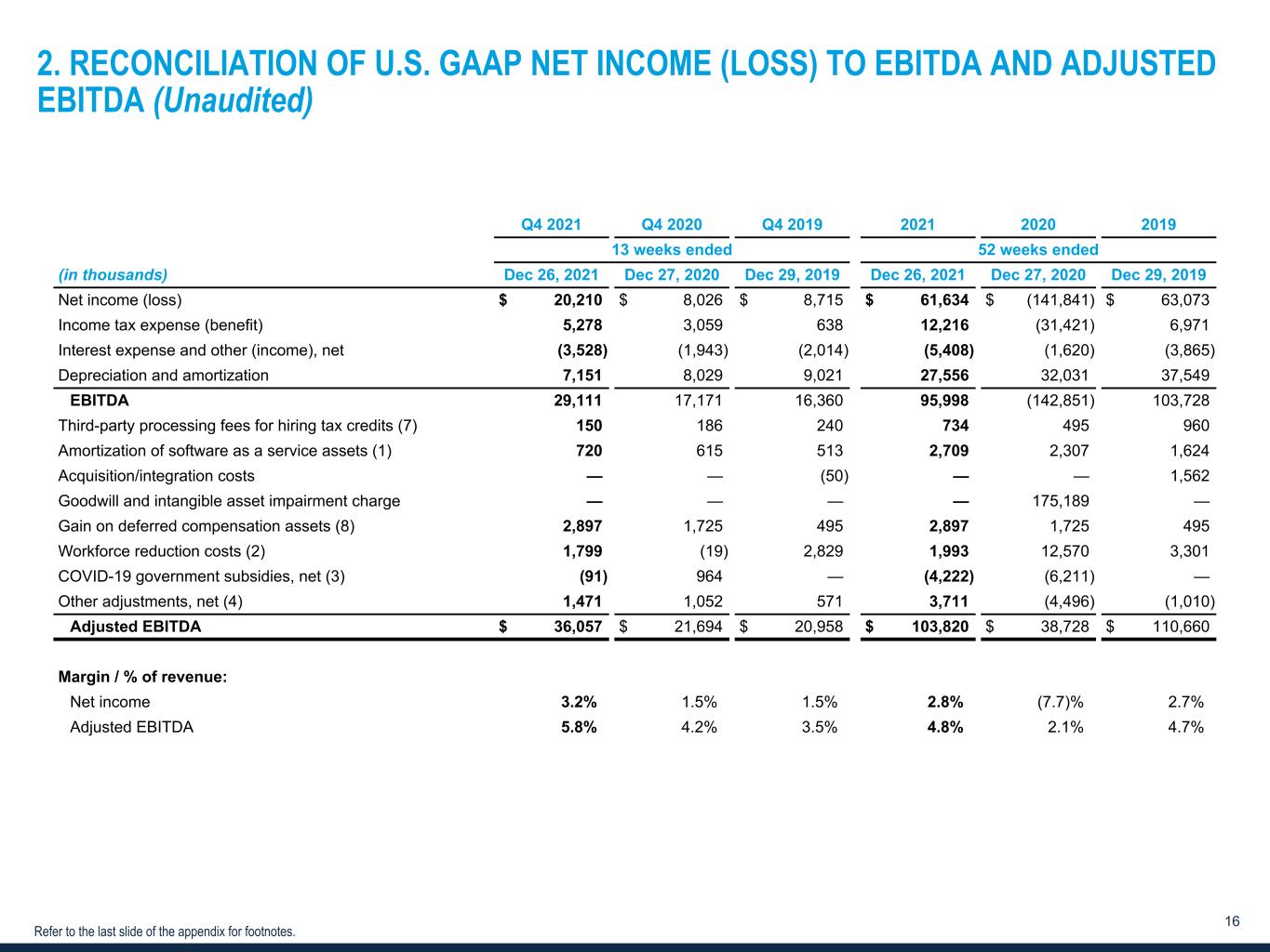 www.TrueBlue.c om 15 1. RECONCILIATION OF U.S. GAAP NET INCOME (LOSS) TO ADJUSTED NET INCOME AND ADJUSTED NET INCOME PER DILUTED SHARE (Unaudited) Refer to the last slide of the appendix for footnotes. Q4 2021 Q4 2020 Q4 2019 2021 2020 2019 13 weeks ended 52 weeks ended (in thousands, except for per share data) Dec 26, 2021 Dec 27, 2020 Dec 29, 2019 Dec 26, 2021 Dec 27, 2020 Dec 29, 2019 Net income (loss) $ 20,210 $ 8,026 $ 8,715 $ 61,634 $ (141,841) $ 63,073 Amortization of intangible assets of acquired businesses 1,503 2,028 4,003 6,704 10,144 17,899 Amortization of software as a service assets (1) 720 615 513 2,709 2,307 1,624 Acquisition/integration costs — — (50) — — 1,562 Goodwill and intangible asset impairment charge — — — — 175,189 — Workforce reduction costs (2) 1,799 (19) 2,829 1,993 12,570 3,301 COVID-19 government subsidies, net (3) (91) 964 — (4,222) (6,211) — Other adjustments, net (4) 1,471 1,052 571 3,711 (4,496) (1,010) Tax effect of adjustments to net income (loss) (5) (1,014) (1,280) (1,102) (1,802) (28,729) (3,273) Adjustment of income taxes to normalized effective rate (6) — — (671) — (3,719) (2,835) Adjusted net income $ 24,598 $ 11,386 $ 14,808 $ 70,727 $ 15,214 $ 80,341 Adjusted net income per diluted share $ 0.69 $ 0.33 $ 0.39 $ 2.00 $ 0.43 $ 2.05 Diluted weighted average shares outstanding 35,621 34,954 38,348 35,429 35,658 39,179