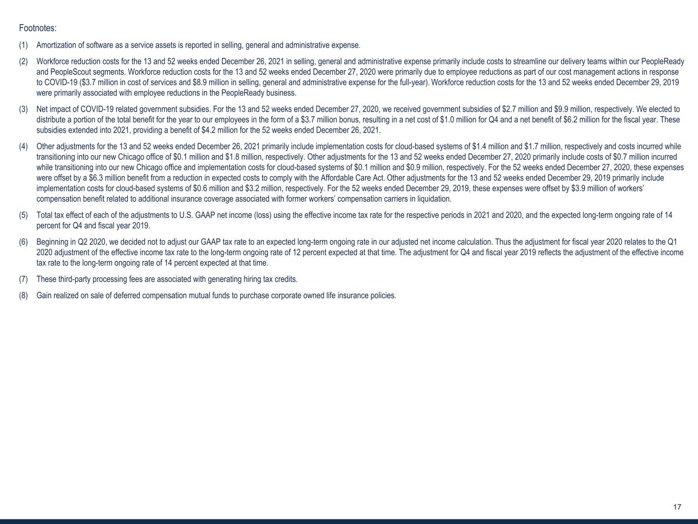 www.TrueBlue.c om 16 Refer to the last slide of the appendix for footnotes. 2. RECONCILIATION OF U.S. GAAP NET INCOME (LOSS) TO EBITDA AND ADJUSTED EBITDA (Unaudited) Q4 2021 Q4 2020 Q4 2019 2021 2020 2019 13 weeks ended 52 weeks ended (in thousands) Dec 26, 2021 Dec 27, 2020 Dec 29, 2019 Dec 26, 2021 Dec 27, 2020 Dec 29, 2019 Net income (loss) $ 20,210 $ 8,026 $ 8,715 $ 61,634 $ (141,841) $ 63,073 Income tax expense (benefit) 5,278 3,059 638 12,216 (31,421) 6,971 Interest expense and other (income), net (3,528) (1,943) (2,014) (5,408) (1,620) (3,865) Depreciation and amortization 7,151 8,029 9,021 27,556 32,031 37,549 EBITDA 29,111 17,171 16,360 95,998 (142,851) 103,728 Third-party processing fees for hiring tax credits (7) 150 186 240 734 495 960 Amortization of software as a service assets (1) 720 615 513 2,709 2,307 1,624 Acquisition/integration costs — — (50) — — 1,562 Goodwill and intangible asset impairment charge — — — — 175,189 — Gain on deferred compensation assets (8) 2,897 1,725 495 2,897 1,725 495 Workforce reduction costs (2) 1,799 (19) 2,829 1,993 12,570 3,301 COVID-19 government subsidies, net (3) (91) 964 — (4,222) (6,211) — Other adjustments, net (4) 1,471 1,052 571 3,711 (4,496) (1,010) Adjusted EBITDA $ 36,057 $ 21,694 $ 20,958 $ 103,820 $ 38,728 $ 110,660 Margin / % of revenue: Net income 3.2 % 1.5 % 1.5 % 2.8 % (7.7) % 2.7 % Adjusted EBITDA 5.8 % 4.2 % 3.5 % 4.8 % 2.1 % 4.7 %