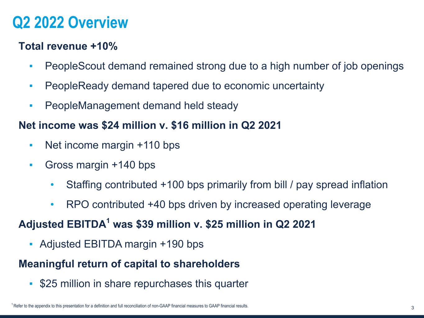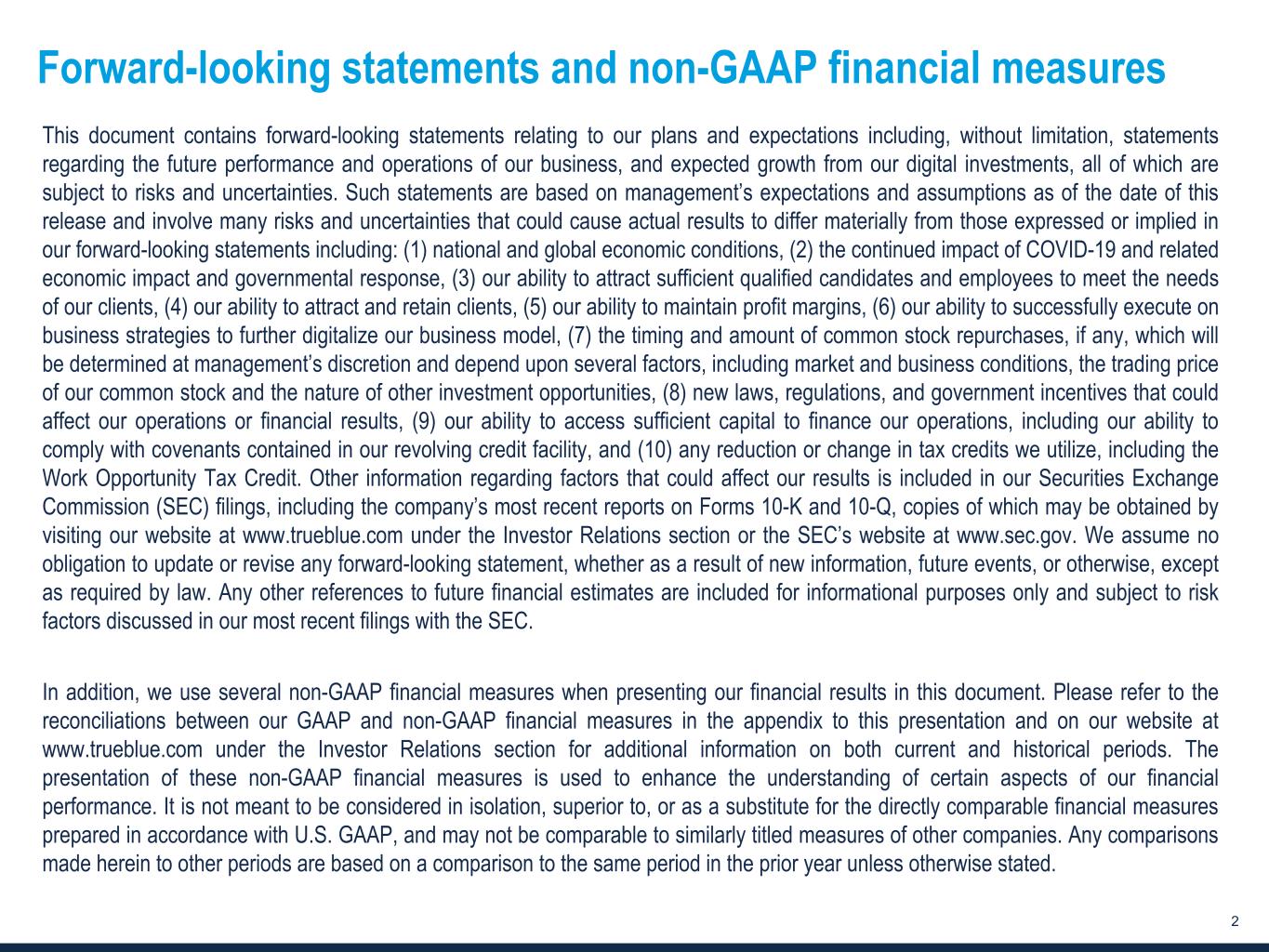 www.TrueBlue.c om 2 Forward-looking statements and non-GAAP financial measures This document contains forward-looking statements relating to our plans and expectations including, without limitation, statements regarding the future performance and operations of our business, and expected growth from our digital investments, all of which are subject to risks and uncertainties. Such statements are based on management’s expectations and assumptions as of the date of this release and involve many risks and uncertainties that could cause actual results to differ materially from those expressed or implied in our forward-looking statements including: (1) national and global economic conditions, (2) the continued impact of COVID-19 and related economic impact and governmental response, (3) our ability to attract sufficient qualified candidates and employees to meet the needs of our clients, (4) our ability to attract and retain clients, (5) our ability to maintain profit margins, (6) our ability to successfully execute on business strategies to further digitalize our business model, (7) the timing and amount of common stock repurchases, if any, which will be determined at management’s discretion and depend upon several factors, including market and business conditions, the trading price of our common stock and the nature of other investment opportunities, (8) new laws, regulations, and government incentives that could affect our operations or financial results, (9) our ability to access sufficient capital to finance our operations, including our ability to comply with covenants contained in our revolving credit facility, and (10) any reduction or change in tax credits we utilize, including the Work Opportunity Tax Credit. Other information regarding factors that could affect our results is included in our Securities Exchange Commission (SEC) filings, including the company’s most recent reports on Forms 10-K and 10-Q, copies of which may be obtained by visiting our website at www.trueblue.com under the Investor Relations section or the SEC’s website at www.sec.gov. We assume no obligation to update or revise any forward-looking statement, whether as a result of new information, future events, or otherwise, except as required by law. Any other references to future financial estimates are included for informational purposes only and subject to risk factors discussed in our most recent filings with the SEC. In addition, we use several non-GAAP financial measures when presenting our financial results in this document. Please refer to the reconciliations between our GAAP and non-GAAP financial measures in the appendix to this presentation and on our website at www.trueblue.com under the Investor Relations section for additional information on both current and historical periods. The presentation of these non-GAAP financial measures is used to enhance the understanding of certain aspects of our financial performance. It is not meant to be considered in isolation, superior to, or as a substitute for the directly comparable financial measures prepared in accordance with U.S. GAAP, and may not be comparable to similarly titled measures of other companies. Any comparisons made herein to other periods are based on a comparison to the same period in the prior year unless otherwise stated.