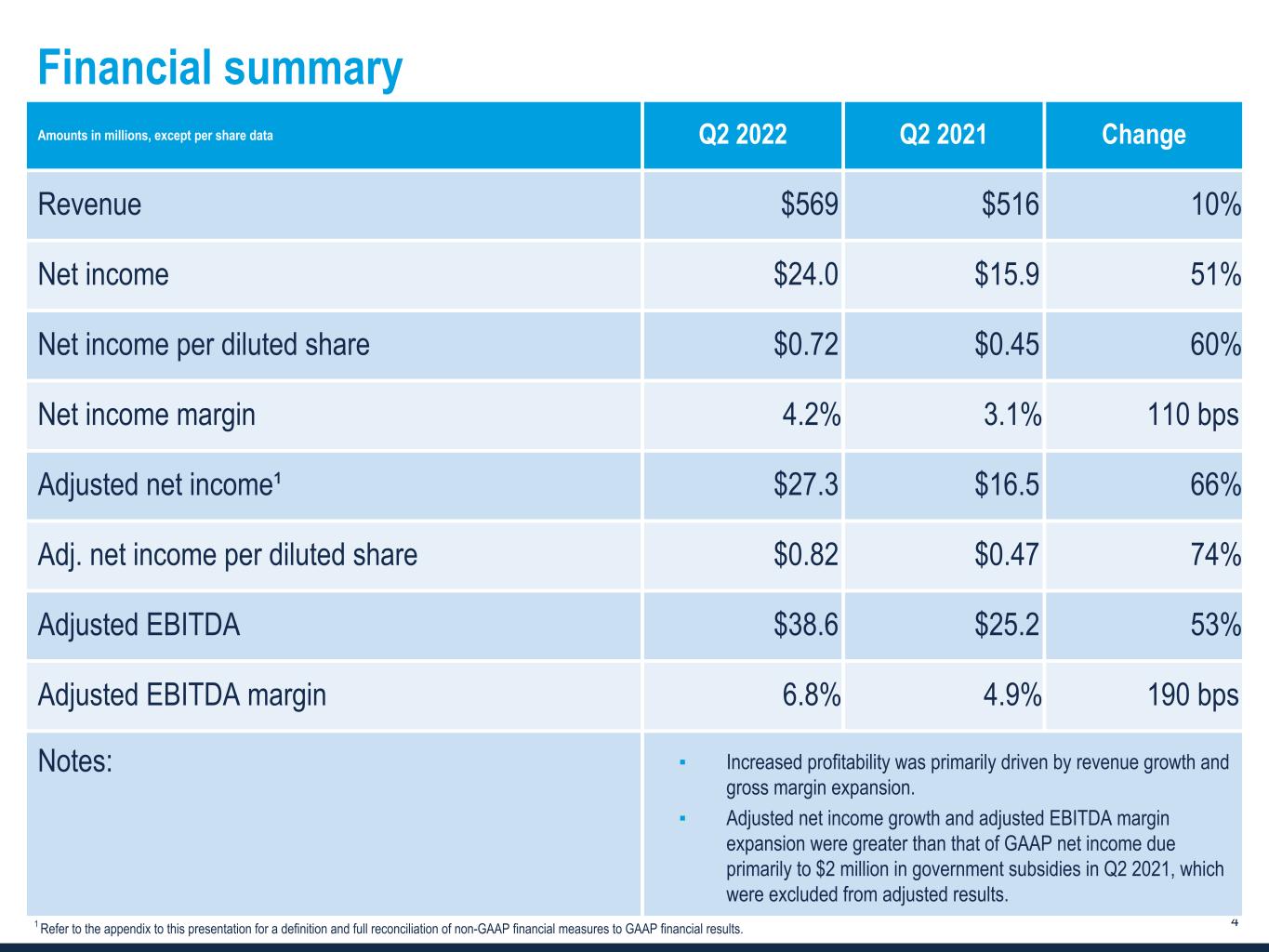 www.TrueBlue.c om 3 Q2 2022 Overview Total revenue +10% ▪ PeopleScout demand remained strong due to a high number of job openings ▪ PeopleReady demand tapered due to economic uncertainty ▪ PeopleManagement demand held steady Net income was $24 million v. $16 million in Q2 2021 ▪ Net income margin +110 bps ▪ Gross margin +140 bps • Staffing contributed +100 bps primarily from bill / pay spread inflation • RPO contributed +40 bps driven by increased operating leverage Adjusted EBITDA1 was $39 million v. $25 million in Q2 2021 ▪ Adjusted EBITDA margin +190 bps Meaningful return of capital to shareholders ▪ $25 million in share repurchases this quarter 1 Refer to the appendix to this presentation for a definition and full reconciliation of non-GAAP financial measures to GAAP financial results.