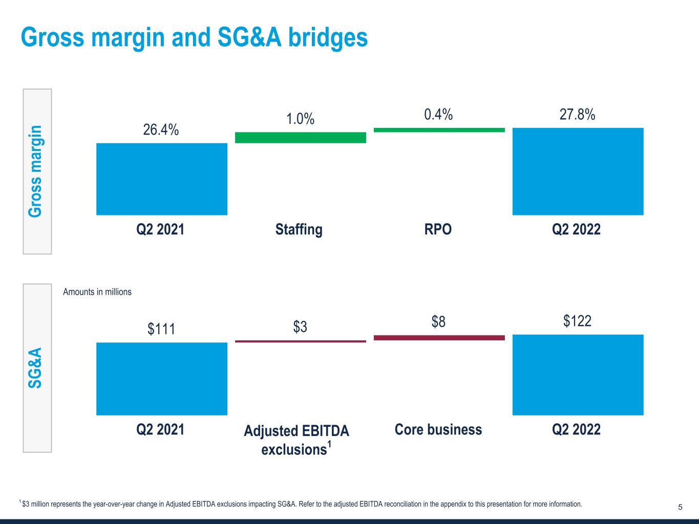 www.TrueBlue.c om 4 Financial summary 1 Refer to the appendix to this presentation for a definition and full reconciliation of non-GAAP financial measures to GAAP financial results. Amounts in millions, except per share data Q2 2022 Q2 2021 Change Revenue $569 $516 10 % Net income $24.0 $15.9 51 % Net income per diluted share $0.72 $0.45 60 % Net income margin 4.2 % 3.1 % 110 bps Adjusted net income¹ $27.3 $16.5 66 % Adj. net income per diluted share $0.82 $0.47 74 % Adjusted EBITDA $38.6 $25.2 53 % Adjusted EBITDA margin 6.8 % 4.9 % 190 bps Notes: ▪ Increased profitability was primarily driven by revenue growth and gross margin expansion. ▪ Adjusted net income growth and adjusted EBITDA margin expansion were greater than that of GAAP net income due primarily to $2 million in government subsidies in Q2 2021, which were excluded from adjusted results.