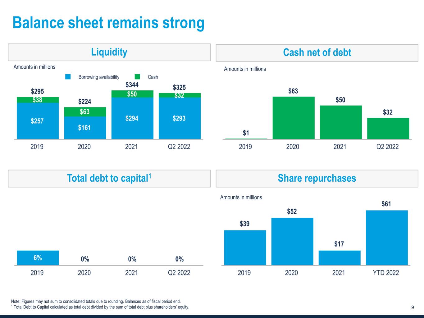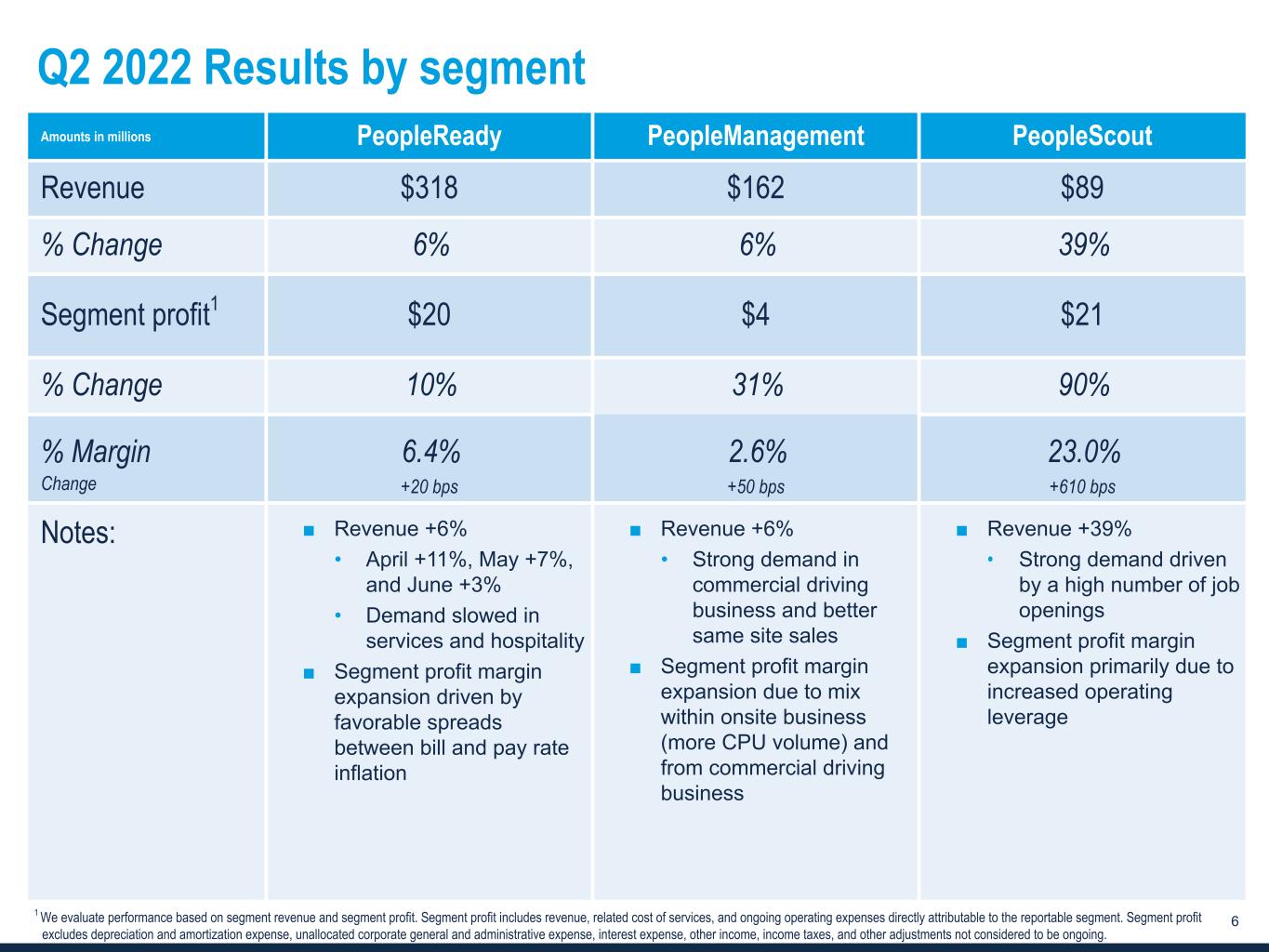 www.TrueBlue.c om 6 Q2 2022 Results by segment Amounts in millions PeopleReady PeopleManagement PeopleScout Revenue $318 $162 $89 % Change 6% 6% 39% Segment profit1 $20 $4 $21 % Change 10% 31% 90% % Margin 6.4% 2.6% 23.0% Change +20 bps +50 bps +610 bps Notes: ■ Revenue +6% • April +11%, May +7%, and June +3% • Demand slowed in services and hospitality ■ Segment profit margin expansion driven by favorable spreads between bill and pay rate inflation ■ Revenue +6% • Strong demand in commercial driving business and better same site sales ■ Segment profit margin expansion due to mix within onsite business (more CPU volume) and from commercial driving business ■ Revenue +39% • Strong demand driven by a high number of job openings ■ Segment profit margin expansion primarily due to increased operating leverage 1 We evaluate performance based on segment revenue and segment profit. Segment profit includes revenue, related cost of services, and ongoing operating expenses directly attributable to the reportable segment. Segment profit excludes depreciation and amortization expense, unallocated corporate general and administrative expense, interest expense, other income, income taxes, and other adjustments not considered to be ongoing.