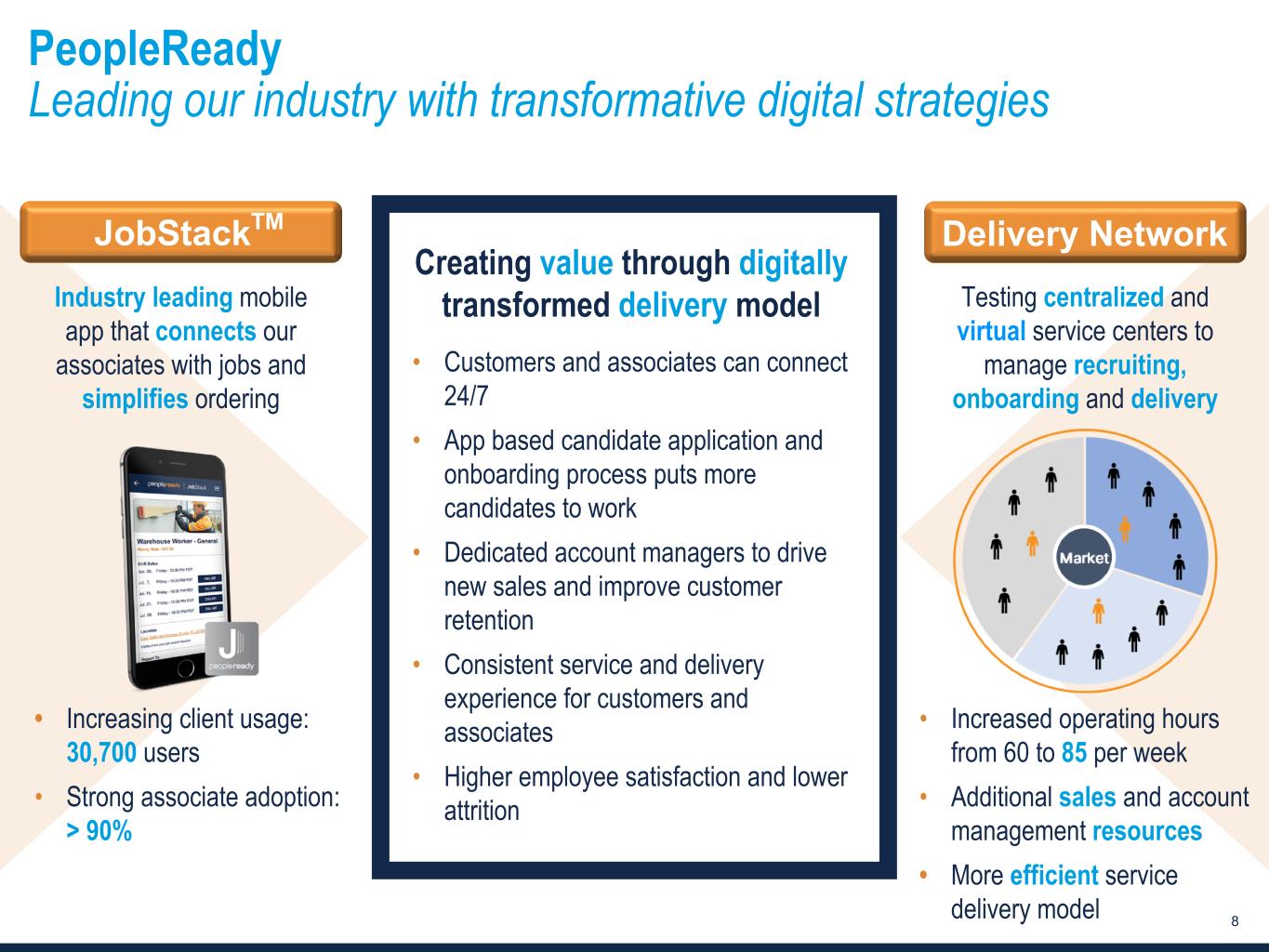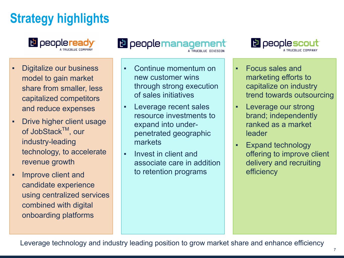 www.TrueBlue.c om 7 Strategy highlights Leverage technology and industry leading position to grow market share and enhance efficiency ▪ Focus sales and marketing efforts to capitalize on industry trend towards outsourcing ▪ Leverage our strong brand; independently ranked as a market leader ▪ Expand technology offering to improve client delivery and recruiting efficiency ▪ Digitalize our business model to gain market share from smaller, less capitalized competitors and reduce expenses ▪ Drive higher client usage of JobStackTM, our industry-leading technology, to accelerate revenue growth ▪ Improve client and candidate experience using centralized services combined with digital onboarding platforms ▪ Continue momentum on new customer wins through strong execution of sales initiatives ▪ Leverage recent sales resource investments to expand into under- penetrated geographic markets ▪ Invest in client and associate care in addition to retention programs