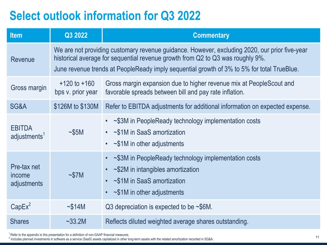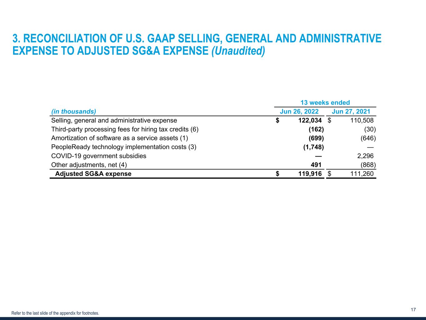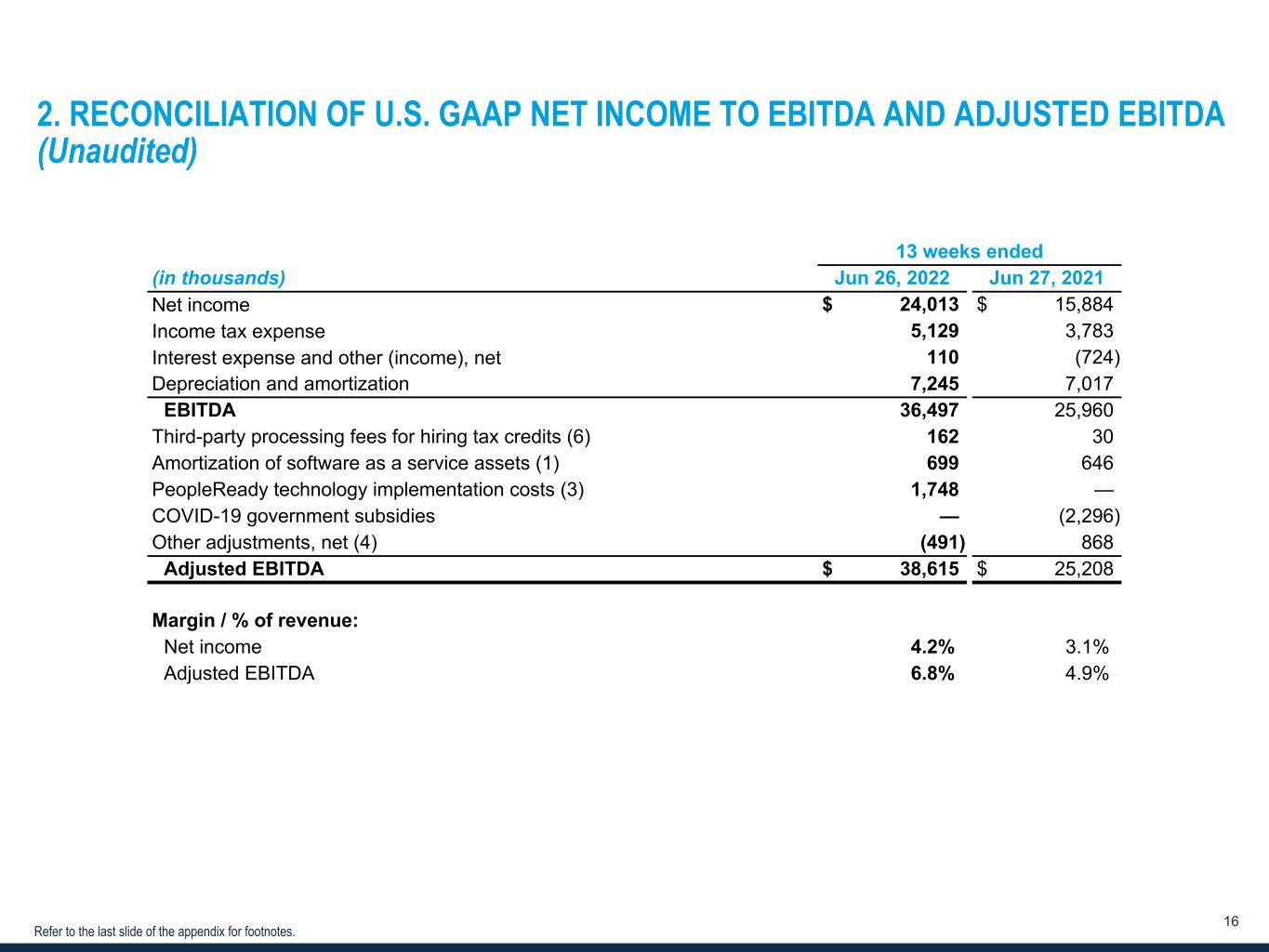 www.TrueBlue.c om 16 Refer to the last slide of the appendix for footnotes. 2. RECONCILIATION OF U.S. GAAP NET INCOME TO EBITDA AND ADJUSTED EBITDA (Unaudited) 13 weeks ended (in thousands) Jun 26, 2022 Jun 27, 2021 Net income $ 24,013 $ 15,884 Income tax expense 5,129 3,783 Interest expense and other (income), net 110 (724) Depreciation and amortization 7,245 7,017 EBITDA 36,497 25,960 Third-party processing fees for hiring tax credits (6) 162 30 Amortization of software as a service assets (1) 699 646 PeopleReady technology implementation costs (3) 1,748 — COVID-19 government subsidies — (2,296) Other adjustments, net (4) (491) 868 Adjusted EBITDA $ 38,615 $ 25,208 Margin / % of revenue: Net income 4.2 % 3.1 % Adjusted EBITDA 6.8 % 4.9 %