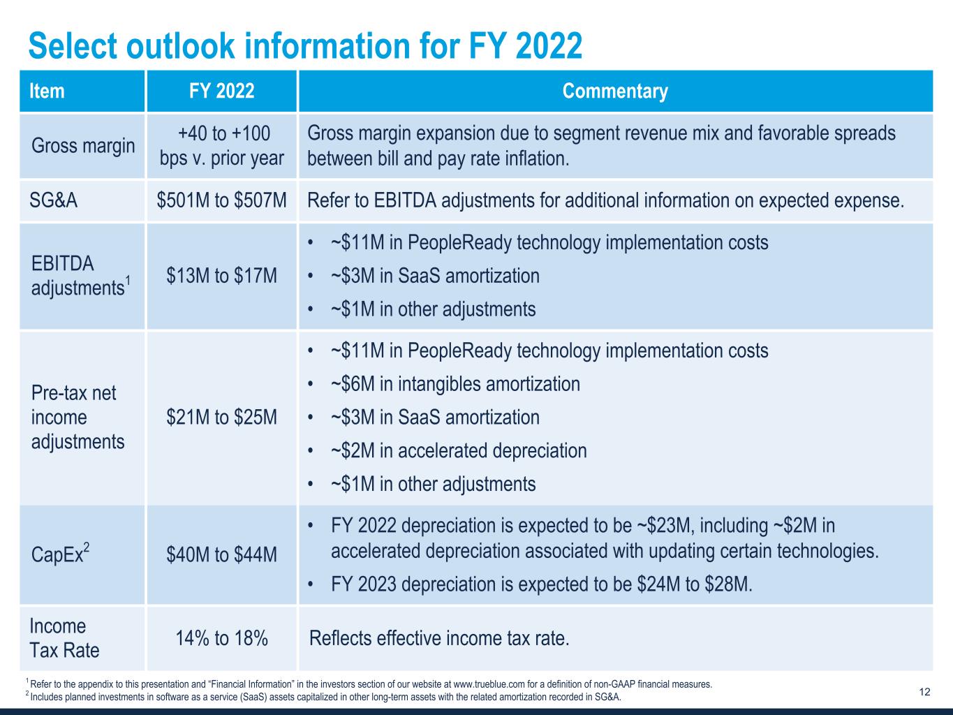 www.TrueBlue.c om 11 Select outlook information for Q3 2022 Item Q3 2022 Commentary Revenue We are not providing customary revenue guidance. However, excluding 2020, our prior five-year historical average for sequential revenue growth from Q2 to Q3 was roughly 9%. June revenue trends at PeopleReady imply sequential growth of 3% to 5% for total TrueBlue. Gross margin +120 to +160 bps v. prior year Gross margin expansion due to higher revenue mix at PeopleScout and favorable spreads between bill and pay rate inflation. SG&A $126M to $130M Refer to EBITDA adjustments for additional information on expected expense. EBITDA adjustments1 ~$5M • ~$3M in PeopleReady technology implementation costs • ~$1M in SaaS amortization • ~$1M in other adjustments Pre-tax net income adjustments ~$7M • ~$3M in PeopleReady technology implementation costs • ~$2M in intangibles amortization • ~$1M in SaaS amortization • ~$1M in other adjustments CapEx2 ~$14M Q3 depreciation is expected to be ~$6M. Shares ~33.2M Reflects diluted weighted average shares outstanding. 1 Refer to the appendix to this presentation for a definition of non-GAAP financial measures. 2 Includes planned investments in software as a service (SaaS) assets capitalized in other long-term assets with the related amortization recorded in SG&A.