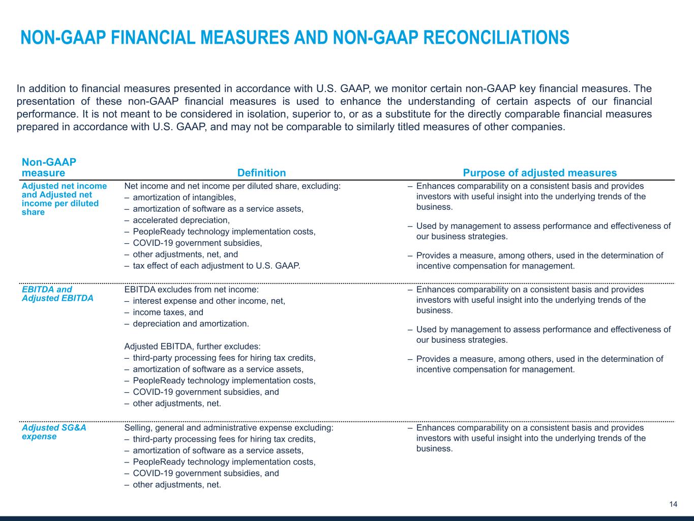 www.TrueBlue.c om 14 NON-GAAP FINANCIAL MEASURES AND NON-GAAP RECONCILIATIONS In addition to financial measures presented in accordance with U.S. GAAP, we monitor certain non-GAAP key financial measures. The presentation of these non-GAAP financial measures is used to enhance the understanding of certain aspects of our financial performance. It is not meant to be considered in isolation, superior to, or as a substitute for the directly comparable financial measures prepared in accordance with U.S. GAAP, and may not be comparable to similarly titled measures of other companies. Non-GAAP measure Definition Purpose of adjusted measures Adjusted net income and Adjusted net income per diluted share Net income and net income per diluted share, excluding: – amortization of intangibles, – amortization of software as a service assets, – accelerated depreciation, – PeopleReady technology implementation costs, – COVID-19 government subsidies, – other adjustments, net, and – tax effect of each adjustment to U.S. GAAP. – Enhances comparability on a consistent basis and provides investors with useful insight into the underlying trends of the business. – Used by management to assess performance and effectiveness of our business strategies. – Provides a measure, among others, used in the determination of incentive compensation for management. EBITDA and Adjusted EBITDA EBITDA excludes from net income: – interest expense and other income, net, – income taxes, and – depreciation and amortization. Adjusted EBITDA, further excludes: – third-party processing fees for hiring tax credits, – amortization of software as a service assets, – PeopleReady technology implementation costs, – COVID-19 government subsidies, and – other adjustments, net. – Enhances comparability on a consistent basis and provides investors with useful insight into the underlying trends of the business. – Used by management to assess performance and effectiveness of our business strategies. – Provides a measure, among others, used in the determination of incentive compensation for management. Adjusted SG&A expense Selling, general and administrative expense excluding: – third-party processing fees for hiring tax credits, – amortization of software as a service assets, – PeopleReady technology implementation costs, – COVID-19 government subsidies, and – other adjustments, net. – Enhances comparability on a consistent basis and provides investors with useful insight into the underlying trends of the business.