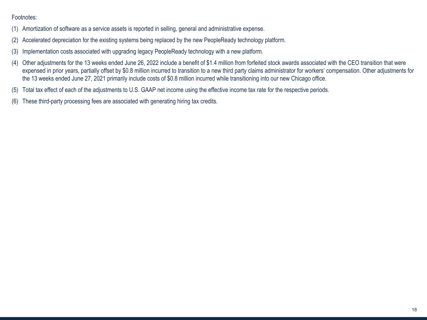 www.TrueBlue.c om 17 Refer to the last slide of the appendix for footnotes. 3. RECONCILIATION OF U.S. GAAP SELLING, GENERAL AND ADMINISTRATIVE EXPENSE TO ADJUSTED SG&A EXPENSE (Unaudited) 13 weeks ended (in thousands) Jun 26, 2022 Jun 27, 2021 Selling, general and administrative expense $ 122,034 $ 110,508 Third-party processing fees for hiring tax credits (6) (162) (30) Amortization of software as a service assets (1) (699) (646) PeopleReady technology implementation costs (3) (1,748) — COVID-19 government subsidies — 2,296 Other adjustments, net (4) 491 (868) Adjusted SG&A expense $ 119,916 $ 111,260