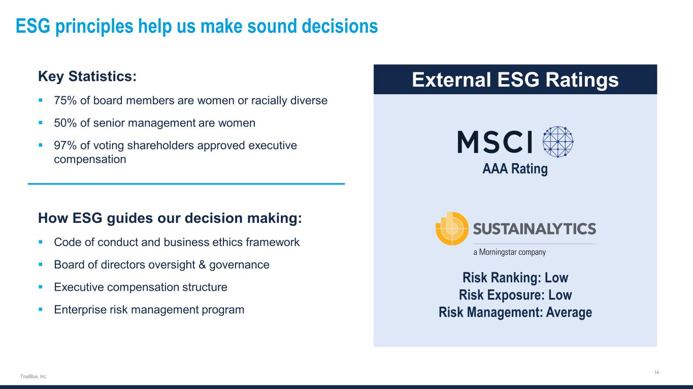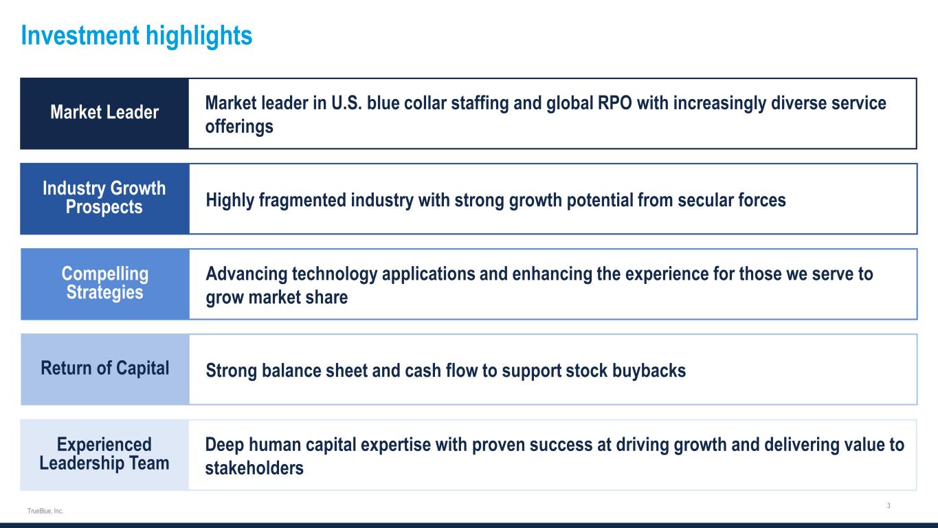 Forward-looking statements and non-GAAP financial measures This document contains forward-looking statements relating to our plans and expectations including, without limitation, statements regarding the future performance and operations of our business, expected growth from our digital investments, and the expected amount and timing of any share repurchases, all of which are subject to risks and uncertainties. Such statements are based on management’s expectations and assumptions as of the date of this release and involve many risks and uncertainties that could cause actual results to differ materially from those expressed or implied in our forward-looking statements including: (1) national and global economic conditions which can be negatively impacted by factors such as rising interest rates, inflation, political instability, epidemics and global trade uncertainty, (2) our ability to attract sufficient qualified candidates and employees to meet the needs of our clients, (3) our ability to attract and retain clients, (4) our ability to maintain profit margins, (5) our ability to successfully execute on business strategies to further digitalize our business model, (6) the timing and amount of common stock repurchases, if any, which will be determined at management’s discretion and depend upon several factors, including market and business conditions, the trading price of our common stock and the nature of other investment opportunities, (7) new laws, regulations, and government incentives that could affect our operations or financial results, (8) our ability to access sufficient capital to finance our operations, including our ability to comply with covenants contained in our revolving credit facility, and (9) any reduction or change in tax credits we utilize, including the Work Opportunity Tax Credit. Other information regarding factors that could affect our results is included in our Securities Exchange Commission (SEC) filings, including the company’s most recent reports on Forms 10-K and 10-Q, copies of which may be obtained by visiting our website at www.trueblue.com under the Investor Relations section or the SEC’s website at www.sec.gov. We assume no obligation to update or revise any forward-looking statement, whether as a result of new information, future events, or otherwise, except as required by law. Any other references to future financial estimates are included for informational purposes only and subject to risk factors discussed in our most recent filings with the SEC. In addition, we use several non-GAAP financial measures when presenting our financial results in this document. Please refer to the reconciliations between our GAAP and non-GAAP financial measures in the appendix to this presentation and on our website at www.trueblue.com under the Investor Relations section for additional information on both current and historical periods. The presentation of these non-GAAP financial measures is used to enhance the understanding of certain aspects of our financial performance. It is not meant to be considered in isolation, superior to, or as a substitute for the directly comparable financial measures prepared in accordance with U.S. GAAP, and may not be comparable to similarly titled measures of other companies. Any comparisons made herein to other periods are based on a comparison to the same period in the prior year unless otherwise stated.