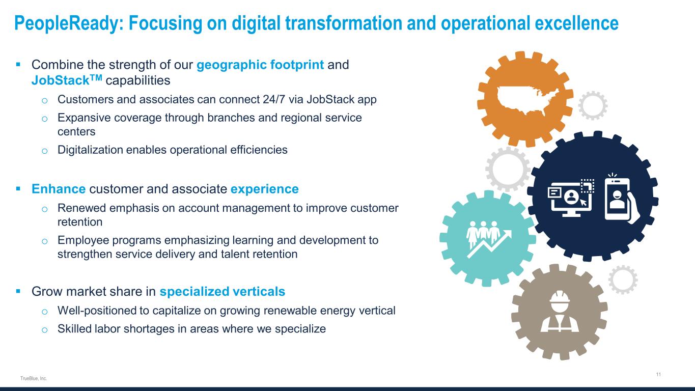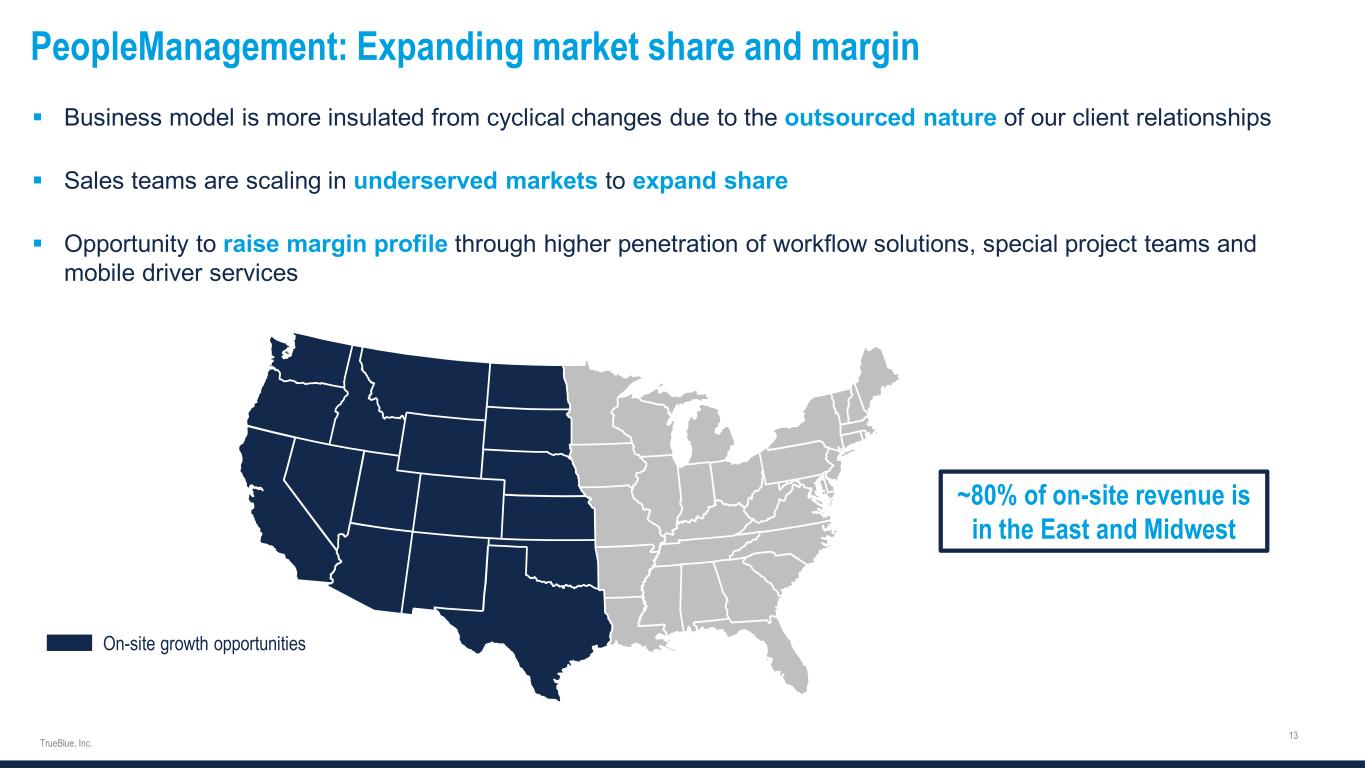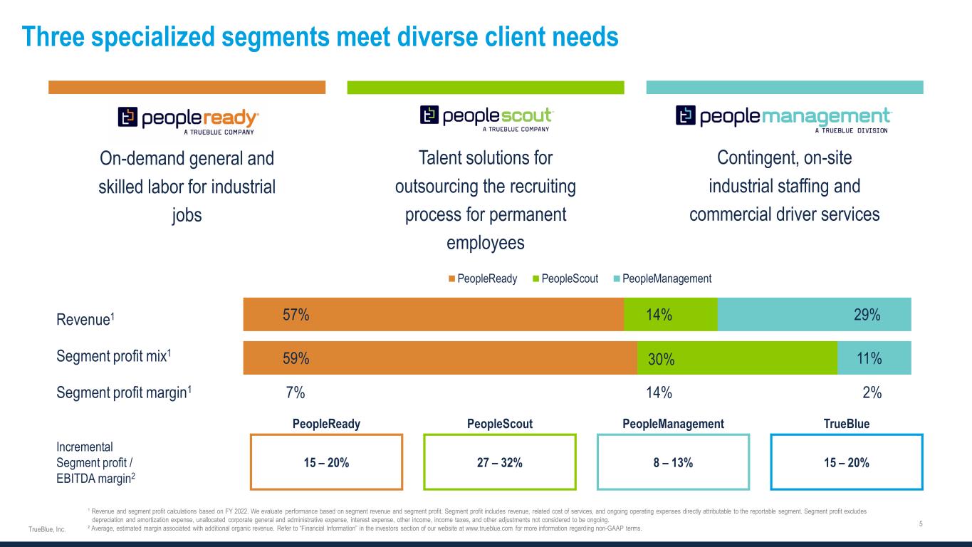 PeopleReady PeopleScout PeopleManagement TrueBlue Incremental Segment profit / EBITDA margin2 15 – 20% 27 – 32% 8 – 13% 15 – 20% Revenue1 Segment profit mix1 Segment profit margin1 7% 14% 2% Three specialized segments meet diverse client needs On-demand general and skilled labor for industrial jobs Talent solutions for outsourcing the recruiting process for permanent employees 1 Revenue and segment profit calculations based on FY 2022. We evaluate performance based on segment revenue and segment profit. Segment profit includes revenue, related cost of services, and ongoing operating expenses directly attributable to the reportable segment. Segment profit excludes depreciation and amortization expense, unallocated corporate general and administrative expense, interest expense, other income, income taxes, and other adjustments not considered to be ongoing. ² Average, estimated margin associated with additional organic revenue. Refer to “Financial Information” in the investors section of our website at www.trueblue.com for more information regarding non-GAAP terms. 57% 59% 14% 30% 29% 11% PeopleReady PeopleScout PeopleManagement Contingent, on-site industrial staffing and commercial driver services