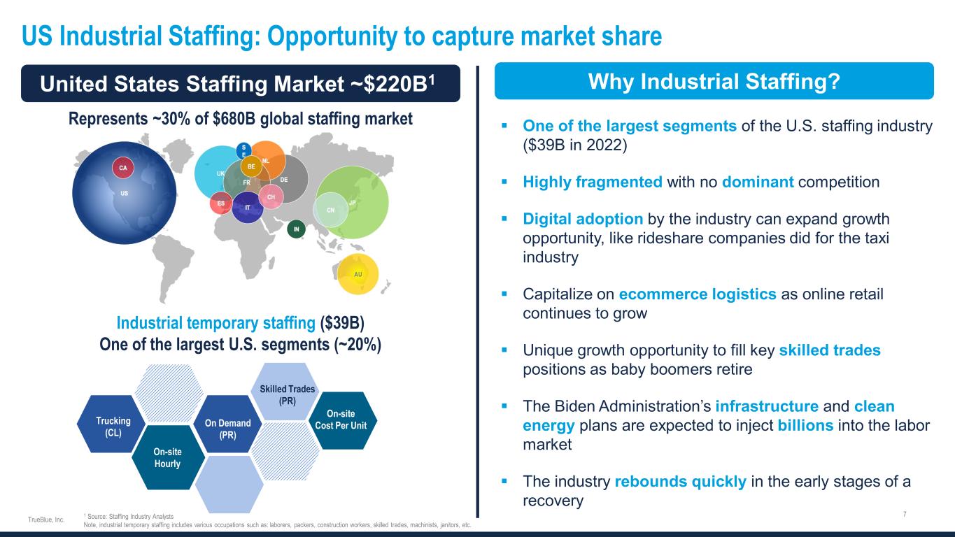 Strategically positioned for secular growth Strong position in attractive vertical markets Powerful secular forces in industrial staffing Deepening of the general contingent labor pool as workers across the generational spectrum are embracing the gig economy (e.g. millennials with side- hustles and semi-retired baby boomers) Positive Demographic Trends Industry is ripe for digital disruption Potential for large providers with sizeable transaction volume to capture market share Opportunity to enhance efficiency and growthCompelling Technology Heightened scrutiny around worker classification (contractor v. employee) Offering a variety of workforce management solutions (e.g. PPO, Employer of Record, MSP) to help clients find compliant solutionsCapitalizing on Industry Evolution 14% 16% 16% 20% Co ns tru cti on Skilled worker shortages in key areas where TrueBlue specializes and has a recruiting edge (e.g. skilled construction) Flight to the suburbs will be a tailwind for the industry Ma nu fac tur ing Political climate favoring investments in domestic manufacturing facilities Tr an sp or tat ion Acute supply / demand gap and high turnover creating the need for temporary truck drivers E-commerce driving the need for more warehouses and more workers per warehouse to facilitate expedited delivery and returns Re tai l TBI FY 2022 Mix by Vertical