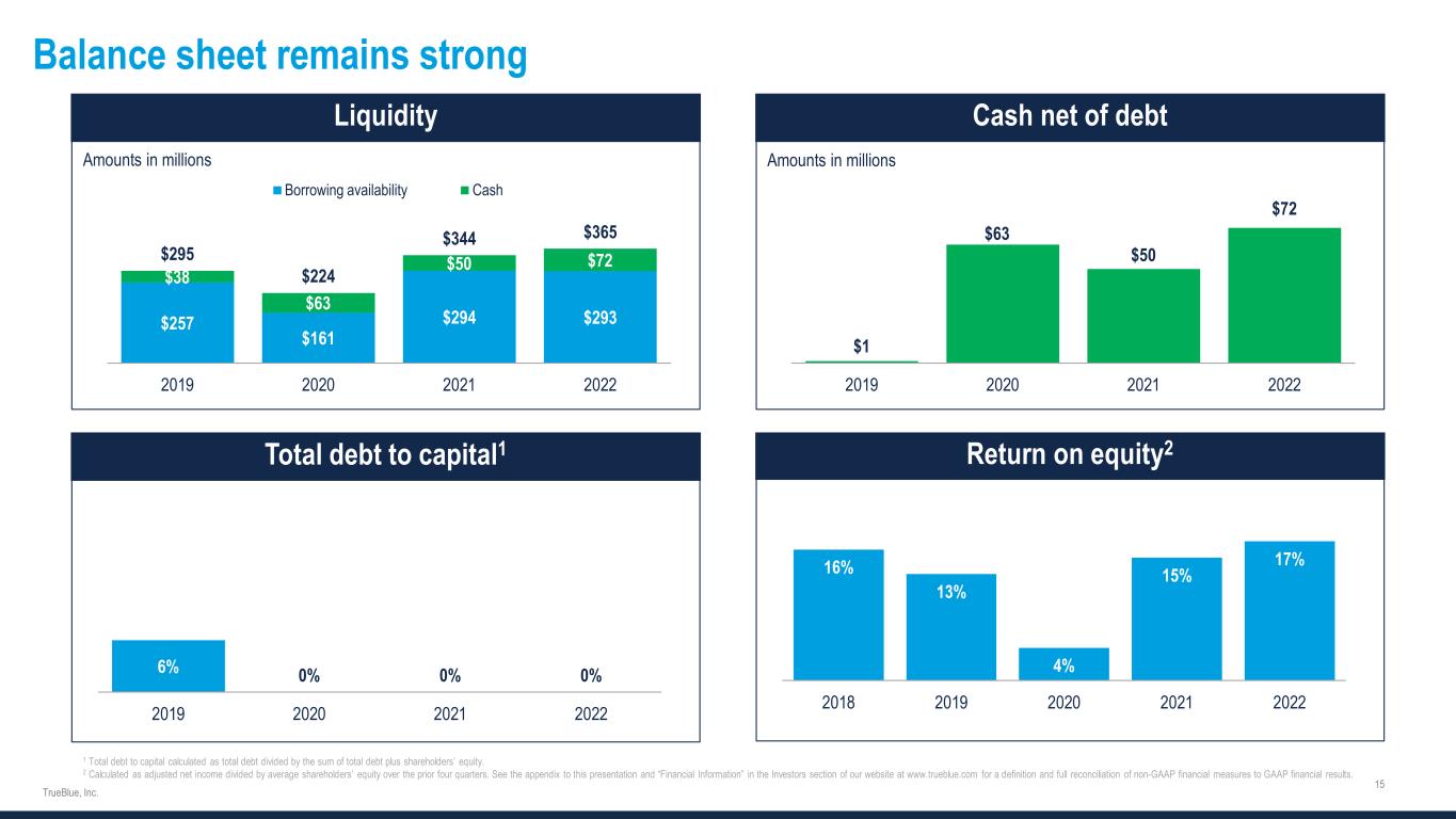 Balance sheet remains strong 1 Total debt to capital calculated as total debt divided by the sum of total debt plus shareholders’ equity. 2 Calculated as adjusted net income divided by average shareholders’ equity over the prior four quarters. See the appendix to this presentation and “Financial Information” in the Investors section of our website at www.trueblue.com for a definition and full reconciliation of non-GAAP financial measures to GAAP financial results. $257 $161 $294 $293 $38 $63 $50 $72$295 $224 $344 $365 2019 2020 2021 2022 Borrowing availability Cash $1 $63 $50 $72 2019 2020 2021 2022 6% 0% 0% 0% 2019 2020 2021 2022 16% 13% 4% 15% 17% 2018 2019 2020 2021 2022 2 Amounts in millions Amounts in millions