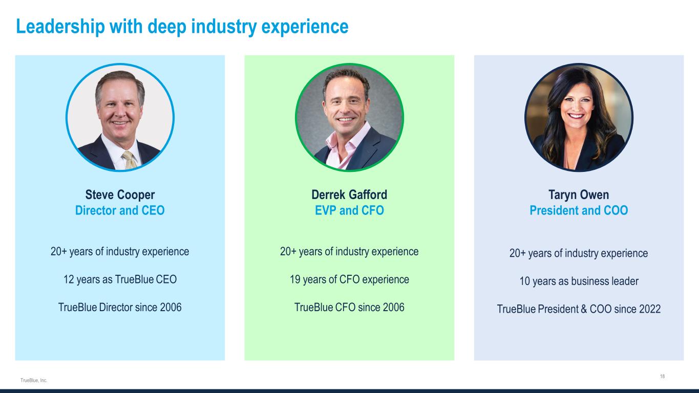 Leadership with deep industry experience Steve Cooper Director and CEO 20+ years of industry experience 12 years as TrueBlue CEO TrueBlue Director since 2006 Derrek Gafford EVP and CFO 20+ years of industry experience 19 years of CFO experience TrueBlue CFO since 2006 Taryn Owen President and COO 20+ years of industry experience 10 years as business leader TrueBlue President & COO since 2022