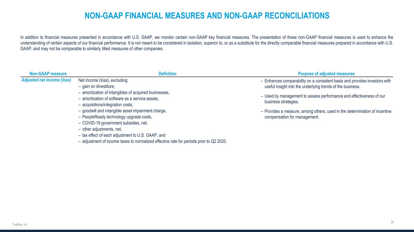 NON-GAAP FINANCIAL MEASURES AND NON-GAAP RECONCILIATIONS In addition to financial measures presented in accordance with U.S. GAAP, we monitor certain non-GAAP key financial measures. The presentation of these non-GAAP financial measures is used to enhance the understanding of certain aspects of our financial performance. It is not meant to be considered in isolation, superior to, or as a substitute for the directly comparable financial measures prepared in accordance with U.S. GAAP, and may not be comparable to similarly titled measures of other companies. Non-GAAP measure Definition Purpose of adjusted measures Adjusted net income (loss) Net income (loss), excluding: – gain on divestiture, – amortization of intangibles of acquired businesses, – amortization of software as a service assets, – acquisitions/integration costs, – goodwill and intangible asset impairment charge, – PeopleReady technology upgrade costs, – COVID-19 government subsidies, net, – other adjustments, net, – tax effect of each adjustment to U.S. GAAP, and – adjustment of income taxes to normalized effective rate for periods prior to Q2 2020. – Enhances comparability on a consistent basis and provides investors with useful insight into the underlying trends of the business. – Used by management to assess performance and effectiveness of our business strategies. – Provides a measure, among others, used in the determination of incentive compensation for management.