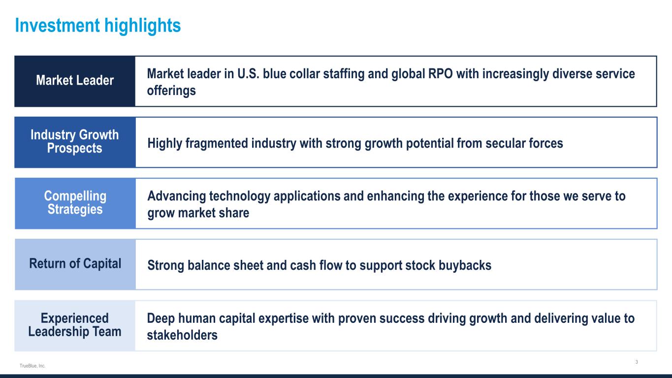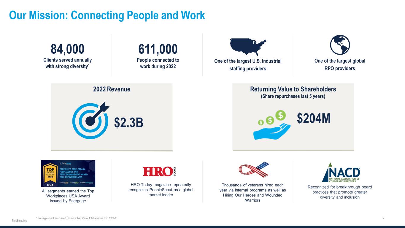 Forward-looking statements This document contains forward-looking statements relating to our plans and expectations including, without limitation, statements regarding the future performance and operations of our business, expected growth from our digital investments, and the expected amount and timing of any share repurchases, all of which are subject to risks and uncertainties. Such statements are based on management’s expectations and assumptions as of the date of this release and involve many risks and uncertainties that could cause actual results to differ materially from those expressed or implied in our forward-looking statements including: (1) national and global economic conditions which can be negatively impacted by factors such as rising interest rates, inflation, political instability, epidemics and global trade uncertainty, (2) our ability to attract sufficient qualified candidates and employees to meet the needs of our clients, (3) our ability to attract and retain clients, (4) our ability to maintain profit margins, (5) our ability to successfully execute on business strategies to further digitalize our business model, (6) the timing and amount of common stock repurchases, if any, which will be determined at management’s discretion and depend upon several factors, including market and business conditions, the trading price of our common stock and the nature of other investment opportunities, (7) new laws, regulations, and government incentives that could affect our operations or financial results, (8) our ability to access sufficient capital to finance our operations, including our ability to comply with covenants contained in our revolving credit facility, and (9) any reduction or change in tax credits we utilize, including the Work Opportunity Tax Credit. Other information regarding factors that could affect our results is included in our Securities Exchange Commission (SEC) filings, including the company’s most recent reports on Forms 10-K and 10-Q, copies of which may be obtained by visiting our website at www.trueblue.com under the Investor Relations section or the SEC’s website at www.sec.gov. We assume no obligation to update or revise any forward-looking statement, whether as a result of new information, future events, or otherwise, except as required by law. Any other references to future financial estimates are included for informational purposes only and subject to risk factors discussed in our most recent filings with the SEC. Any comparisons made herein to other periods are based on a comparison to the same period in the prior year unless otherwise stated.