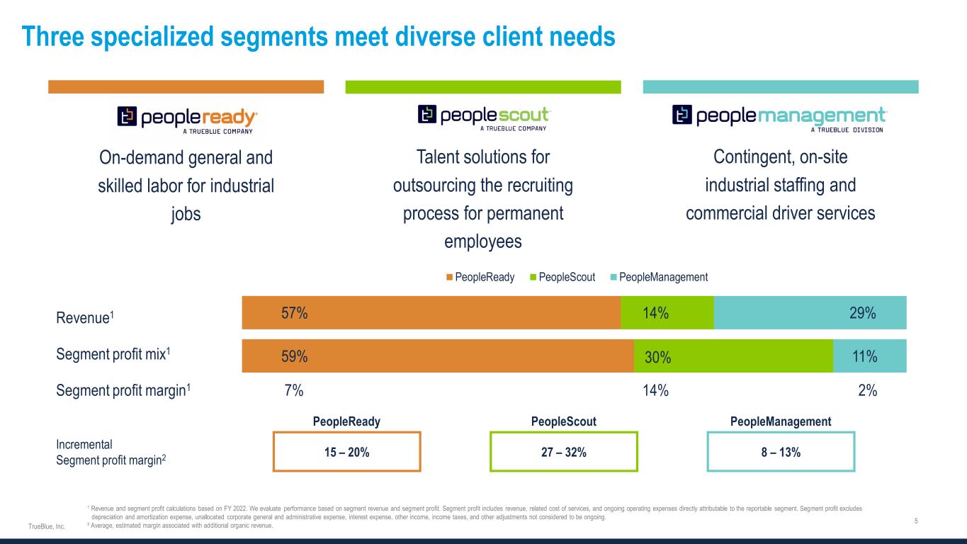 PeopleReady PeopleScout PeopleManagement Incremental Segment profit margin2 15 – 20% 27 – 32% 8 – 13% Revenue1 Segment profit mix1 Segment profit margin1 7% 14% 2% Three specialized segments meet diverse client needs On-demand general and skilled labor for industrial jobs Talent solutions for outsourcing the recruiting process for permanent employees 1 Revenue and segment profit calculations based on FY 2022. We evaluate performance based on segment revenue and segment profit. Segment profit includes revenue, related cost of services, and ongoing operating expenses directly attributable to the reportable segment. Segment profit excludes depreciation and amortization expense, unallocated corporate general and administrative expense, interest expense, other income, income taxes, and other adjustments not considered to be ongoing. ² Average, estimated margin associated with additional organic revenue. 57% 59% 14% 30% 29% 11% PeopleReady PeopleScout PeopleManagement Contingent, on-site industrial staffing and commercial driver services
