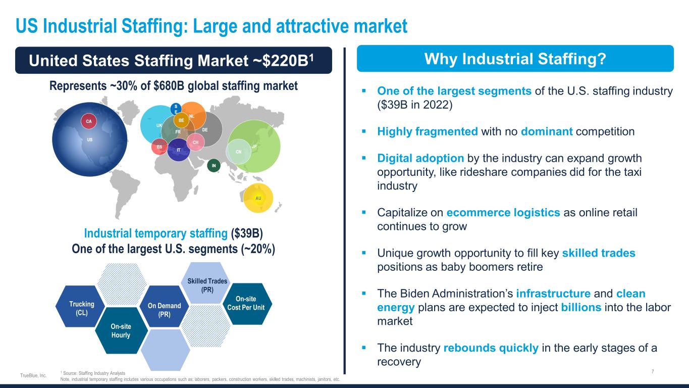 Strategically positioned for secular growth Strong position in attractive vertical markets Powerful secular forces in industrial staffing Deepening of the general contingent labor pool as workers across the generational spectrum are embracing the gig economy (e.g. millennials with side- hustles and semi-retired baby boomers) Positive Demographic Trends Industry is ripe for digital disruption Potential for large providers with sizeable transaction volume to capture market share Opportunity to enhance efficiency and growthCompelling Technology Heightened scrutiny around worker classification (contractor v. employee) Offering a variety of workforce management solutions (e.g. PPO, Employer of Record, MSP) to help clients find compliant solutionsCapitalizing on Industry Evolution 14% 16% 16% 20% Co ns tru cti on Skilled worker shortages in key areas where TrueBlue specializes and has a recruiting edge (e.g. skilled construction) Flight to the suburbs will be a tailwind for the industry Ma nu fac tur ing Political climate favoring investments in domestic manufacturing facilities Tr an sp or tat ion Acute supply / demand gap and high turnover creating the need for temporary truck drivers E-commerce driving the need for more warehouses and more workers per warehouse to facilitate expedited delivery and returns Re tai l TBI FY 2022 Mix by Vertical