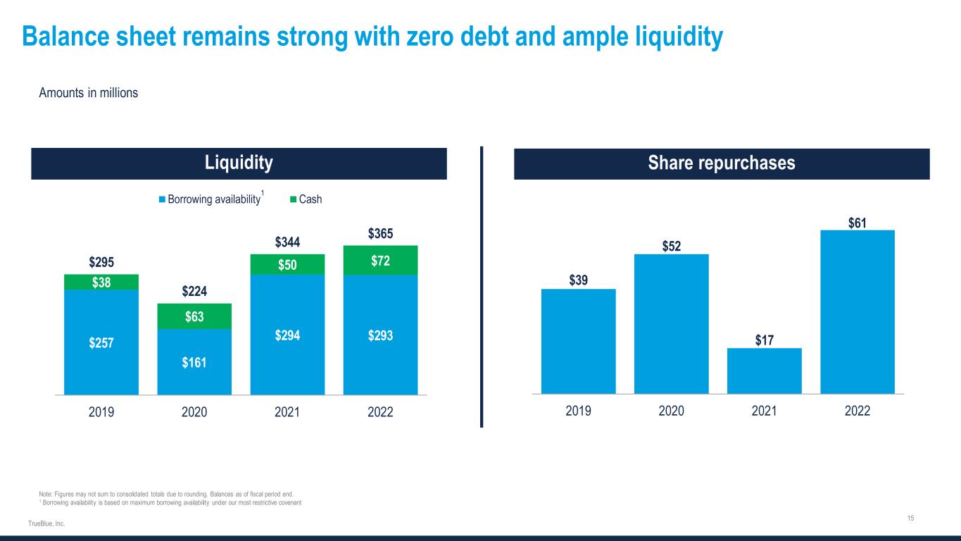 Balance sheet remains strong with zero debt and ample liquidity Note: Figures may not sum to consolidated totals due to rounding. Balances as of fiscal period end. 1 Borrowing availability is based on maximum borrowing availability under our most restrictive covenant $257 $161 $294 $293 $38 $63 $50 $72$295 $224 $344 $365 2019 2020 2021 2022 Borrowing availability Cash $39 $52 $17 $61 2019 2020 2021 2022 Amounts in millions 1