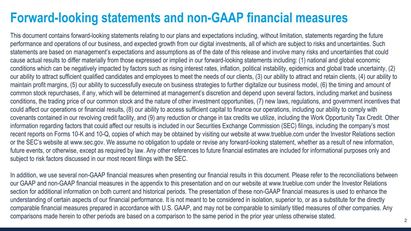 2 Forward-looking statements and non-GAAP financial measures This document contains forward-looking statements relating to our plans and expectations including, without limitation, statements regarding the future performance and operations of our business, and expected growth from our digital investments, all of which are subject to risks and uncertainties. Such statements are based on management’s expectations and assumptions as of the date of this release and involve many risks and uncertainties that could cause actual results to differ materially from those expressed or implied in our forward-looking statements including: (1) national and global economic conditions which can be negatively impacted by factors such as rising interest rates, inflation, political instability, epidemics and global trade uncertainty, (2) our ability to attract sufficient qualified candidates and employees to meet the needs of our clients, (3) our ability to attract and retain clients, (4) our ability to maintain profit margins, (5) our ability to successfully execute on business strategies to further digitalize our business model, (6) the timing and amount of common stock repurchases, if any, which will be determined at management’s discretion and depend upon several factors, including market and business conditions, the trading price of our common stock and the nature of other investment opportunities, (7) new laws, regulations, and government incentives that could affect our operations or financial results, (8) our ability to access sufficient capital to finance our operations, including our ability to comply with covenants contained in our revolving credit facility, and (9) any reduction or change in tax credits we utilize, including the Work Opportunity Tax Credit. Other information regarding factors that could affect our results is included in our Securities Exchange Commission (SEC) filings, including the company’s most recent reports on Forms 10-K and 10-Q, copies of which may be obtained by visiting our website at www.trueblue.com under the Investor Relations section or the SEC’s website at www.sec.gov. We assume no obligation to update or revise any forward-looking statement, whether as a result of new information, future events, or otherwise, except as required by law. Any other references to future financial estimates are included for informational purposes only and subject to risk factors discussed in our most recent filings with the SEC. In addition, we use several non-GAAP financial measures when presenting our financial results in this document. Please refer to the reconciliations between our GAAP and non-GAAP financial measures in the appendix to this presentation and on our website at www.trueblue.com under the Investor Relations section for additional information on both current and historical periods. The presentation of these non-GAAP financial measures is used to enhance the understanding of certain aspects of our financial performance. It is not meant to be considered in isolation, superior to, or as a substitute for the directly comparable financial measures prepared in accordance with U.S. GAAP, and may not be comparable to similarly titled measures of other companies. Any comparisons made herein to other periods are based on a comparison to the same period in the prior year unless otherwise stated.