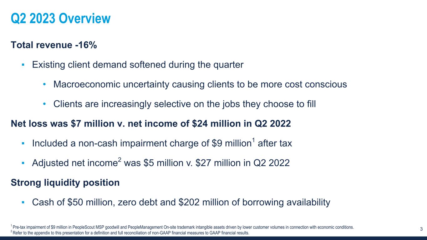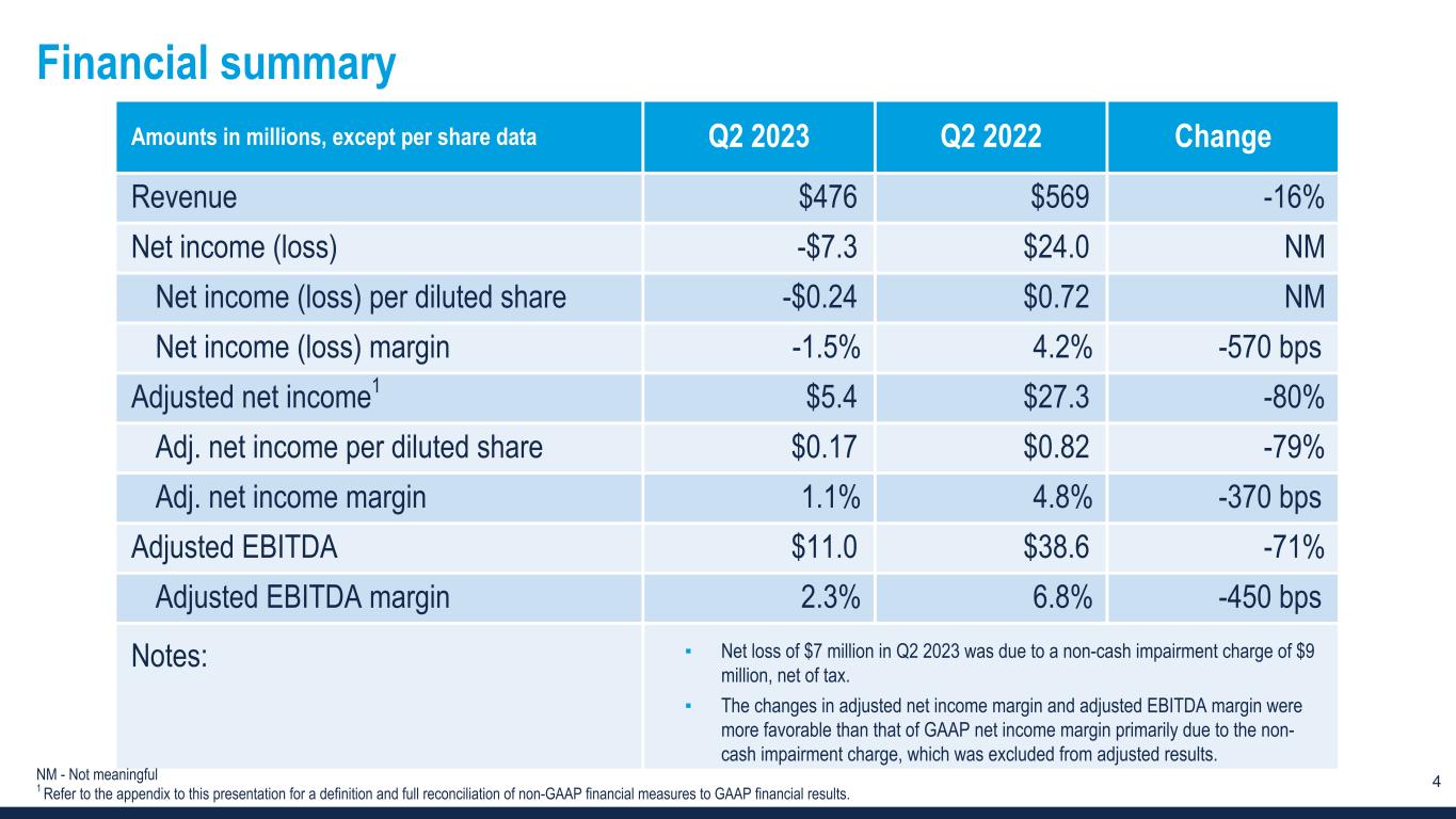 3 Q2 2023 Overview Total revenue -16% ▪ Existing client demand softened during the quarter • Macroeconomic uncertainty causing clients to be more cost conscious • Clients are increasingly selective on the jobs they choose to fill Net loss was $7 million v. net income of $24 million in Q2 2022 ▪ Included a non-cash impairment charge of $9 million1 after tax ▪ Adjusted net income2 was $5 million v. $27 million in Q2 2022 Strong liquidity position ▪ Cash of $50 million, zero debt and $202 million of borrowing availability 1 Pre-tax impairment of $9 million in PeopleScout MSP goodwill and PeopleManagement On-site trademark intangible assets driven by lower customer volumes in connection with economic conditions. 2 Refer to the appendix to this presentation for a definition and full reconciliation of non-GAAP financial measures to GAAP financial results.