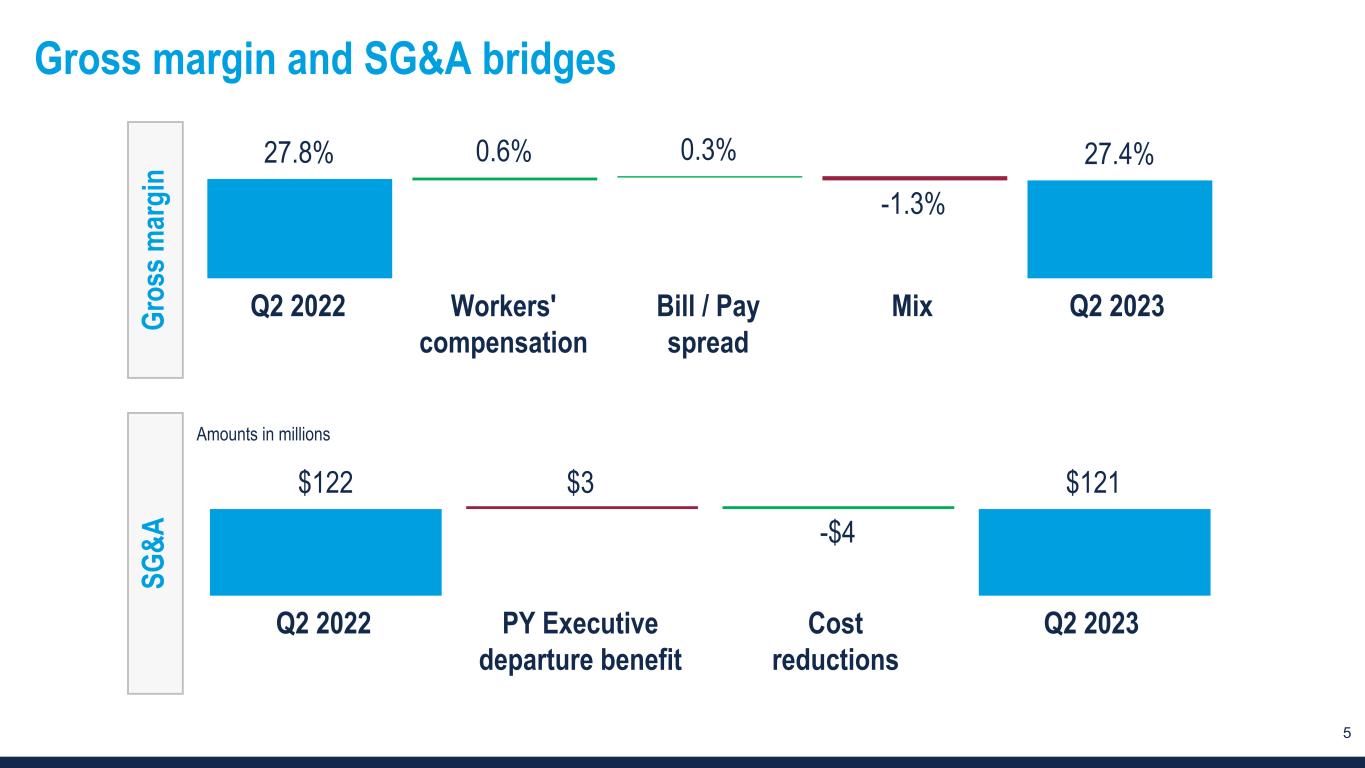 4 Financial summary Amounts in millions, except per share data Q2 2023 Q2 2022 Change Revenue $476 $569 -16 % Net income (loss) -$7.3 $24.0 NM Net income (loss) per diluted share -$0.24 $0.72 NM Net income (loss) margin -1.5 % 4.2 % -570 bps Adjusted net income1 $5.4 $27.3 -80 % Adj. net income per diluted share $0.17 $0.82 -79 % Adj. net income margin 1.1 % 4.8 % -370 bps Adjusted EBITDA $11.0 $38.6 -71 % Adjusted EBITDA margin 2.3 % 6.8 % -450 bps Notes: ▪ Net loss of $7 million in Q2 2023 was due to a non-cash impairment charge of $9 million, net of tax. ▪ The changes in adjusted net income margin and adjusted EBITDA margin were more favorable than that of GAAP net income margin primarily due to the non- cash impairment charge, which was excluded from adjusted results. NM - Not meaningful 1 Refer to the appendix to this presentation for a definition and full reconciliation of non-GAAP financial measures to GAAP financial results.