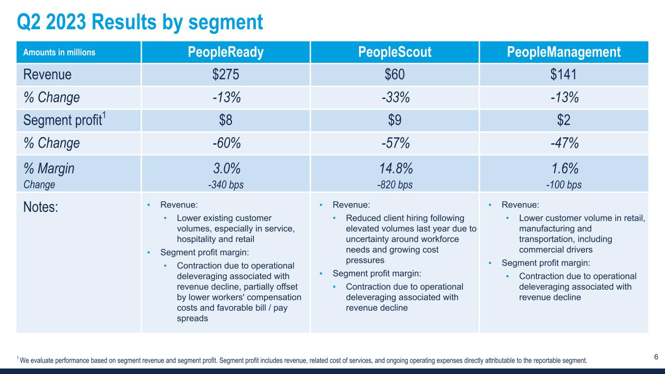 5 Gross margin and SG&A bridges Gr os s m ar gi n 27.8% 0.6% 0.3% -1.3% 27.4% Q2 2022 Workers' compensation Bill / Pay spread Mix Q2 2023 SG &A $122 $3 -$4 $121 Q2 2022 PY Executive departure benefit Cost reductions Q2 2023 Amounts in millions