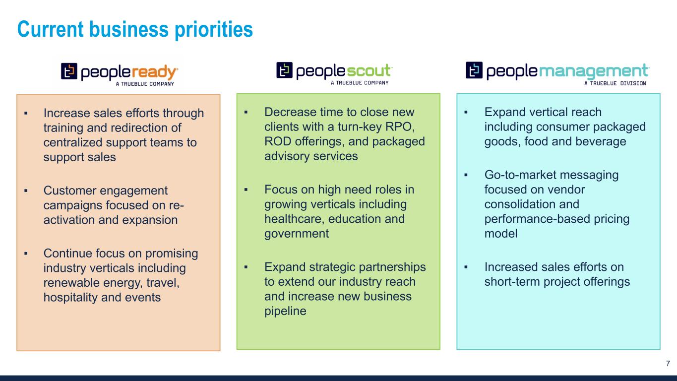 6 Q2 2023 Results by segment Amounts in millions PeopleReady PeopleScout PeopleManagement Revenue $275 $60 $141 % Change -13% -33% -13% Segment profit1 $8 $9 $2 % Change -60% -57% -47% % Margin 3.0% 14.8% 1.6% Change -340 bps -820 bps -100 bps Notes: ▪ Revenue: • Lower existing customer volumes, especially in service, hospitality and retail ▪ Segment profit margin: ▪ Contraction due to operational deleveraging associated with revenue decline, partially offset by lower workers' compensation costs and favorable bill / pay spreads ▪ Revenue: • Reduced client hiring following elevated volumes last year due to uncertainty around workforce needs and growing cost pressures ▪ Segment profit margin: ▪ Contraction due to operational deleveraging associated with revenue decline ▪ Revenue: • Lower customer volume in retail, manufacturing and transportation, including commercial drivers ▪ Segment profit margin: ▪ Contraction due to operational deleveraging associated with revenue decline 1 We evaluate performance based on segment revenue and segment profit. Segment profit includes revenue, related cost of services, and ongoing operating expenses directly attributable to the reportable segment.