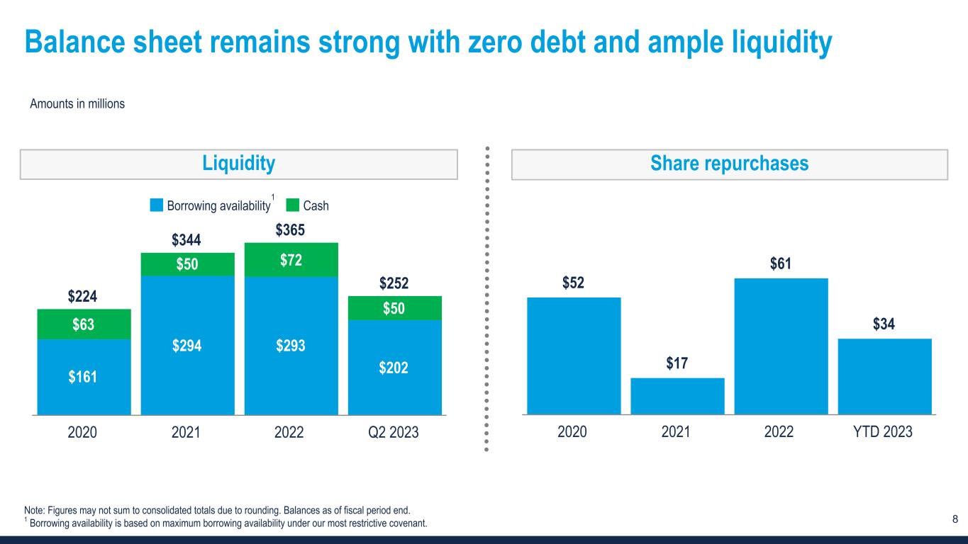 8 $52 $17 $61 $34 2020 2021 2022 YTD 2023 Balance sheet remains strong with zero debt and ample liquidity $224 $344 $365 $252 $161 $294 $293 $202 $63 $50 $72 $50 Borrowing availability Cash 2020 2021 2022 Q2 2023 Amounts in millions Note: Figures may not sum to consolidated totals due to rounding. Balances as of fiscal period end. 1 Borrowing availability is based on maximum borrowing availability under our most restrictive covenant. Liquidity Share repurchases 1