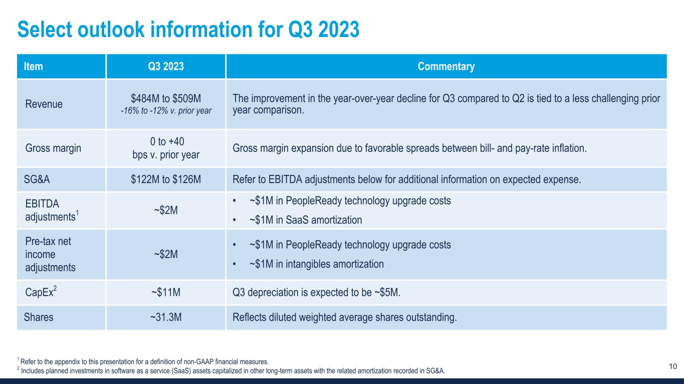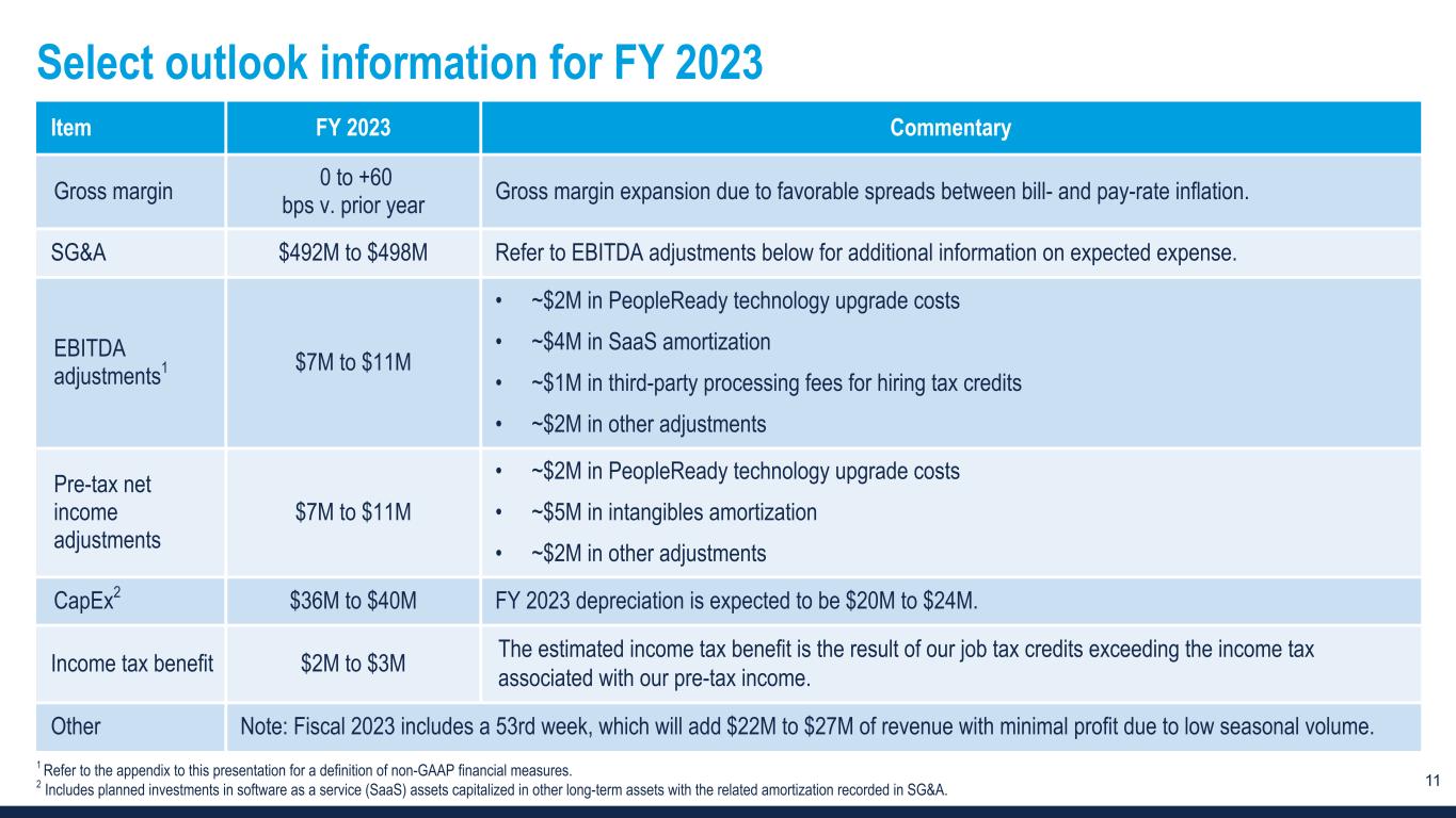 10 Select outlook information for Q3 2023 Item Q3 2023 Commentary Revenue $484M to $509M -16% to -12% v. prior year The improvement in the year-over-year decline for Q3 compared to Q2 is tied to a less challenging prior year comparison. Gross margin 0 to +40 bps v. prior year Gross margin expansion due to favorable spreads between bill- and pay-rate inflation. SG&A $122M to $126M Refer to EBITDA adjustments below for additional information on expected expense. EBITDA adjustments1 ~$2M • ~$1M in PeopleReady technology upgrade costs • ~$1M in SaaS amortization Pre-tax net income adjustments ~$2M • ~$1M in PeopleReady technology upgrade costs • ~$1M in intangibles amortization CapEx2 ~$11M Q3 depreciation is expected to be ~$5M. Shares ~31.3M Reflects diluted weighted average shares outstanding. 1 Refer to the appendix to this presentation for a definition of non-GAAP financial measures. 2 Includes planned investments in software as a service (SaaS) assets capitalized in other long-term assets with the related amortization recorded in SG&A.