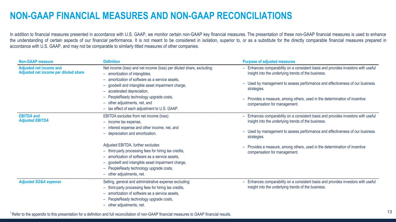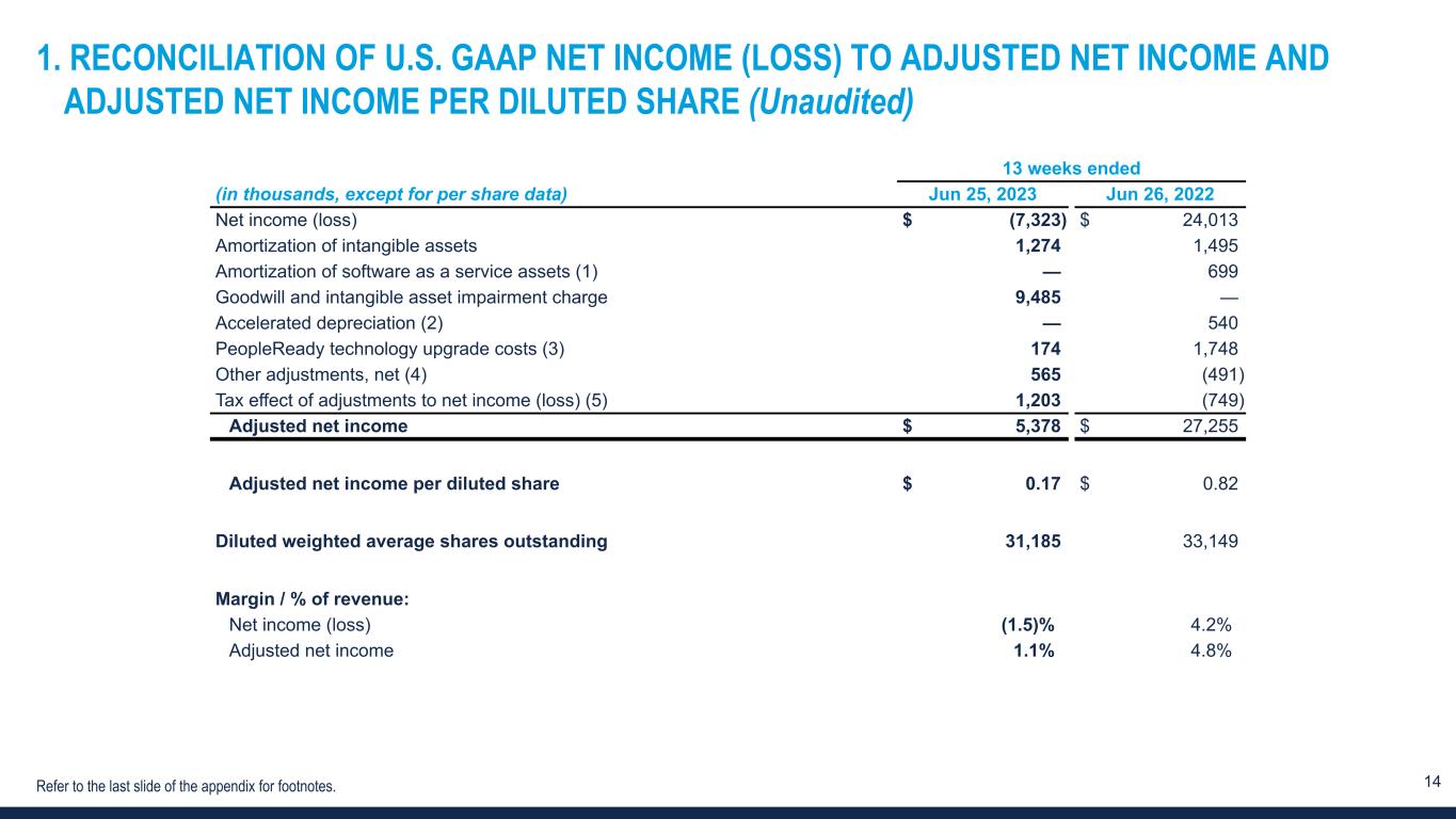 13 NON-GAAP FINANCIAL MEASURES AND NON-GAAP RECONCILIATIONS 1 Refer to the appendix to this presentation for a definition and full reconciliation of non-GAAP financial measures to GAAP financial results. In addition to financial measures presented in accordance with U.S. GAAP, we monitor certain non-GAAP key financial measures. The presentation of these non-GAAP financial measures is used to enhance the understanding of certain aspects of our financial performance. It is not meant to be considered in isolation, superior to, or as a substitute for the directly comparable financial measures prepared in accordance with U.S. GAAP, and may not be comparable to similarly titled measures of other companies. Non-GAAP measure Definition Purpose of adjusted measures Adjusted net income and Adjusted net income per diluted share Net income (loss) and net income (loss) per diluted share, excluding: – amortization of intangibles, – amortization of software as a service assets, – goodwill and intangible asset impairment charge, – accelerated depreciation, – PeopleReady technology upgrade costs, – other adjustments, net, and – tax effect of each adjustment to U.S. GAAP. – Enhances comparability on a consistent basis and provides investors with useful insight into the underlying trends of the business. – Used by management to assess performance and effectiveness of our business strategies. – Provides a measure, among others, used in the determination of incentive compensation for management. EBITDA and Adjusted EBITDA EBITDA excludes from net income (loss): – income tax expense, – interest expense and other income, net, and – depreciation and amortization. Adjusted EBITDA, further excludes: – third-party processing fees for hiring tax credits, – amortization of software as a service assets, – goodwill and intangible asset impairment charge, – PeopleReady technology upgrade costs, – other adjustments, net. – Enhances comparability on a consistent basis and provides investors with useful insight into the underlying trends of the business. – Used by management to assess performance and effectiveness of our business strategies. – Provides a measure, among others, used in the determination of incentive compensation for management. Adjusted SG&A expense Selling, general and administrative expense excluding: – third-party processing fees for hiring tax credits, – amortization of software as a service assets, – PeopleReady technology upgrade costs, – other adjustments, net. – Enhances comparability on a consistent basis and provides investors with useful insight into the underlying trends of the business.