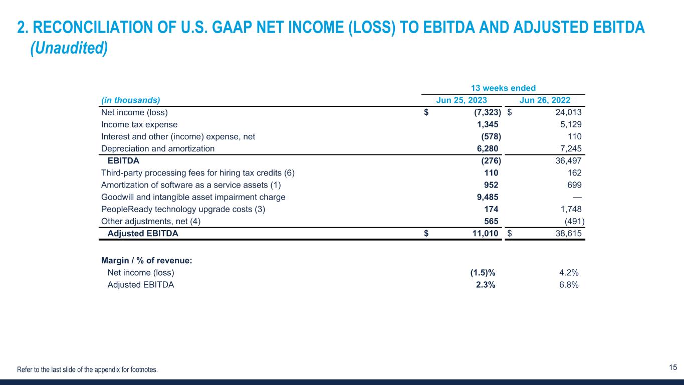 14 1. RECONCILIATION OF U.S. GAAP NET INCOME (LOSS) TO ADJUSTED NET INCOME AND ADJUSTED NET INCOME PER DILUTED SHARE (Unaudited) 13 weeks ended (in thousands, except for per share data) Jun 25, 2023 Jun 26, 2022 Net income (loss) $ (7,323) $ 24,013 Amortization of intangible assets 1,274 1,495 Amortization of software as a service assets (1) — 699 Goodwill and intangible asset impairment charge 9,485 — Accelerated depreciation (2) — 540 PeopleReady technology upgrade costs (3) 174 1,748 Other adjustments, net (4) 565 (491) Tax effect of adjustments to net income (loss) (5) 1,203 (749) Adjusted net income $ 5,378 $ 27,255 Adjusted net income per diluted share $ 0.17 $ 0.82 Diluted weighted average shares outstanding 31,185 33,149 Margin / % of revenue: Net income (loss) (1.5) % 4.2 % Adjusted net income 1.1 % 4.8 % Refer to the last slide of the appendix for footnotes.