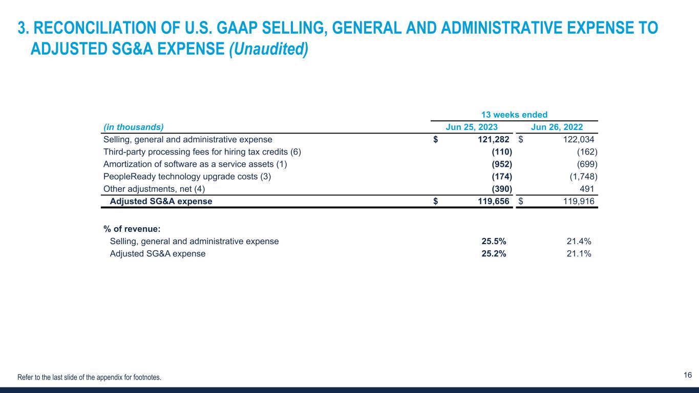 15 2. RECONCILIATION OF U.S. GAAP NET INCOME (LOSS) TO EBITDA AND ADJUSTED EBITDA (Unaudited) 13 weeks ended (in thousands) Jun 25, 2023 Jun 26, 2022 Net income (loss) $ (7,323) $ 24,013 Income tax expense 1,345 5,129 Interest and other (income) expense, net (578) 110 Depreciation and amortization 6,280 7,245 EBITDA (276) 36,497 Third-party processing fees for hiring tax credits (6) 110 162 Amortization of software as a service assets (1) 952 699 Goodwill and intangible asset impairment charge 9,485 — PeopleReady technology upgrade costs (3) 174 1,748 Other adjustments, net (4) 565 (491) Adjusted EBITDA $ 11,010 $ 38,615 Margin / % of revenue: Net income (loss) (1.5) % 4.2 % Adjusted EBITDA 2.3 % 6.8 % Refer to the last slide of the appendix for footnotes.