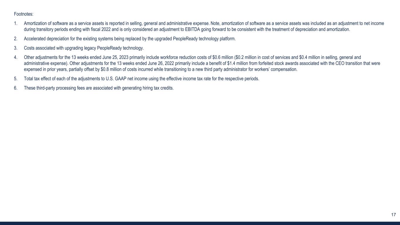 16 3. RECONCILIATION OF U.S. GAAP SELLING, GENERAL AND ADMINISTRATIVE EXPENSE TO ADJUSTED SG&A EXPENSE (Unaudited) 13 weeks ended (in thousands) Jun 25, 2023 Jun 26, 2022 Selling, general and administrative expense $ 121,282 $ 122,034 Third-party processing fees for hiring tax credits (6) (110) (162) Amortization of software as a service assets (1) (952) (699) PeopleReady technology upgrade costs (3) (174) (1,748) Other adjustments, net (4) (390) 491 Adjusted SG&A expense $ 119,656 $ 119,916 % of revenue: Selling, general and administrative expense 25.5 % 21.4 % Adjusted SG&A expense 25.2 % 21.1 % Refer to the last slide of the appendix for footnotes.