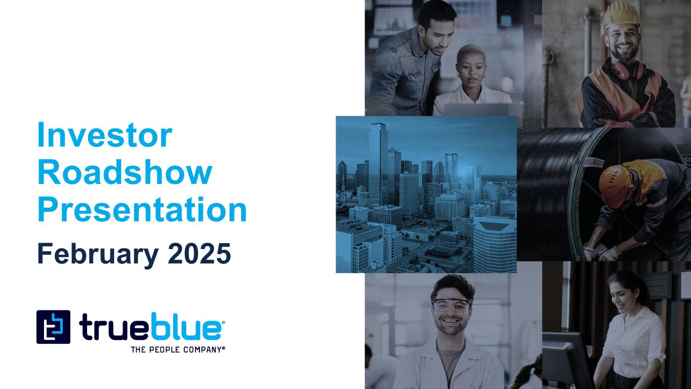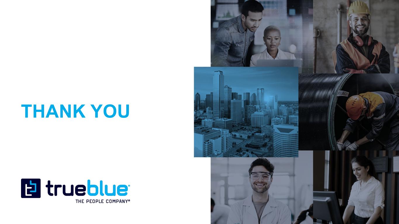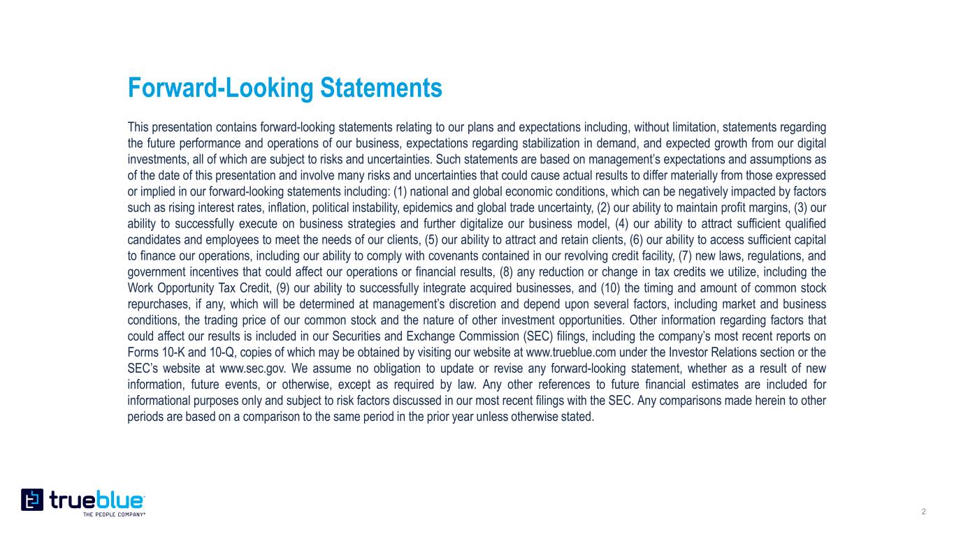 Forward-Looking Statements This presentation contains forward-looking statements relating to our plans and expectations including, without limitation, statements regarding the future performance and operations of our business, expectations regarding stabilization in demand, and expected growth from our digital investments, all of which are subject to risks and uncertainties. Such statements are based on management’s expectations and assumptions as of the date of this presentation and involve many risks and uncertainties that could cause actual results to differ materially from those expressed or implied in our forward-looking statements including: (1) national and global economic conditions, which can be negatively impacted by factors such as rising interest rates, inflation, political instability, epidemics and global trade uncertainty, (2) our ability to maintain profit margins, (3) our ability to successfully execute on business strategies and further digitalize our business model, (4) our ability to attract sufficient qualified candidates and employees to meet the needs of our clients, (5) our ability to attract and retain clients, (6) our ability to access sufficient capital to finance our operations, including our ability to comply with covenants contained in our revolving credit facility, (7) new laws, regulations, and government incentives that could affect our operations or financial results, (8) any reduction or change in tax credits we utilize, including the Work Opportunity Tax Credit, (9) our ability to successfully integrate acquired businesses, and (10) the timing and amount of common stock repurchases, if any, which will be determined at management’s discretion and depend upon several factors, including market and business conditions, the trading price of our common stock and the nature of other investment opportunities. Other information regarding factors that could affect our results is included in our Securities and Exchange Commission (SEC) filings, including the company’s most recent reports on Forms 10-K and 10-Q, copies of which may be obtained by visiting our website at www.trueblue.com under the Investor Relations section or the SEC’s website at www.sec.gov. We assume no obligation to update or revise any forward-looking statement, whether as a result of new information, future events, or otherwise, except as required by law. Any other references to future financial estimates are included for informational purposes only and subject to risk factors discussed in our most recent filings with the SEC. Any comparisons made herein to other periods are based on a comparison to the same period in the prior year unless otherwise stated.