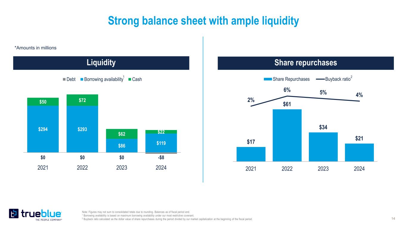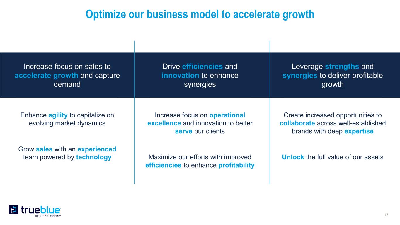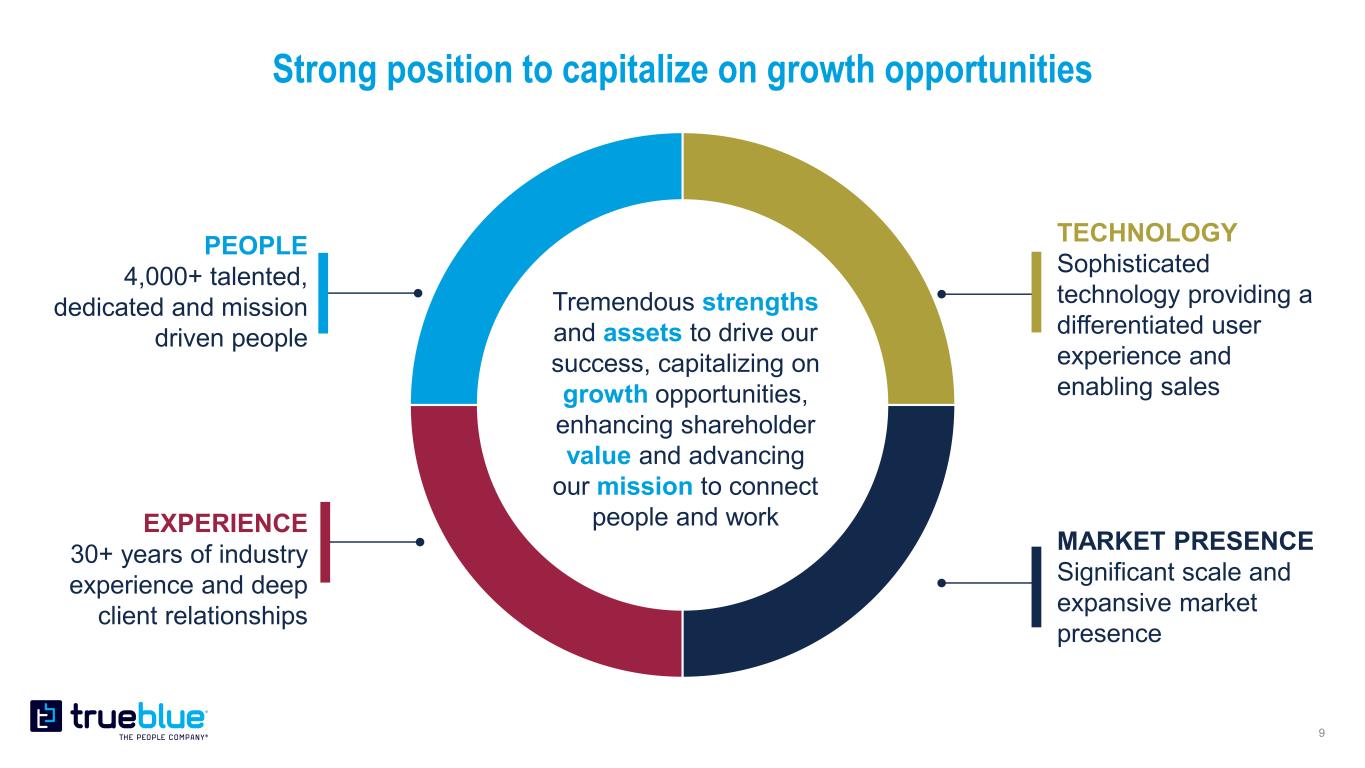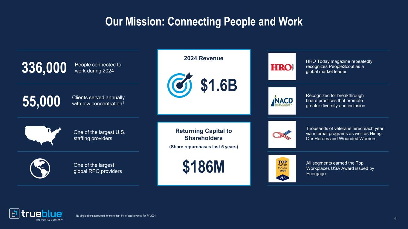 Forward-Looking Statements This presentation contains forward-looking statements relating to our plans and expectations including, without limitation, statements regarding the future performance and operations of our business, expectations regarding stabilization in demand, and expected growth from our digital investments, all of which are subject to risks and uncertainties. Such statements are based on management’s expectations and assumptions as of the date of this presentation and involve many risks and uncertainties that could cause actual results to differ materially from those expressed or implied in our forward-looking statements including: (1) national and global economic conditions, which can be negatively impacted by factors such as rising interest rates, inflation, political instability, epidemics and global trade uncertainty, (2) our ability to maintain profit margins, (3) our ability to successfully execute on business strategies and further digitalize our business model, (4) our ability to attract sufficient qualified candidates and employees to meet the needs of our clients, (5) our ability to attract and retain clients, (6) our ability to access sufficient capital to finance our operations, including our ability to comply with covenants contained in our revolving credit facility, (7) new laws, regulations, and government incentives that could affect our operations or financial results, (8) any reduction or change in tax credits we utilize, including the Work Opportunity Tax Credit, (9) our ability to successfully integrate acquired businesses, and (10) the timing and amount of common stock repurchases, if any, which will be determined at management’s discretion and depend upon several factors, including market and business conditions, the trading price of our common stock and the nature of other investment opportunities. Other information regarding factors that could affect our results is included in our Securities and Exchange Commission (SEC) filings, including the company’s most recent reports on Forms 10-K and 10-Q, copies of which may be obtained by visiting our website at www.trueblue.com under the Investor Relations section or the SEC’s website at www.sec.gov. We assume no obligation to update or revise any forward-looking statement, whether as a result of new information, future events, or otherwise, except as required by law. Any other references to future financial estimates are included for informational purposes only and subject to risk factors discussed in our most recent filings with the SEC. Any comparisons made herein to other periods are based on a comparison to the same period in the prior year unless otherwise stated.