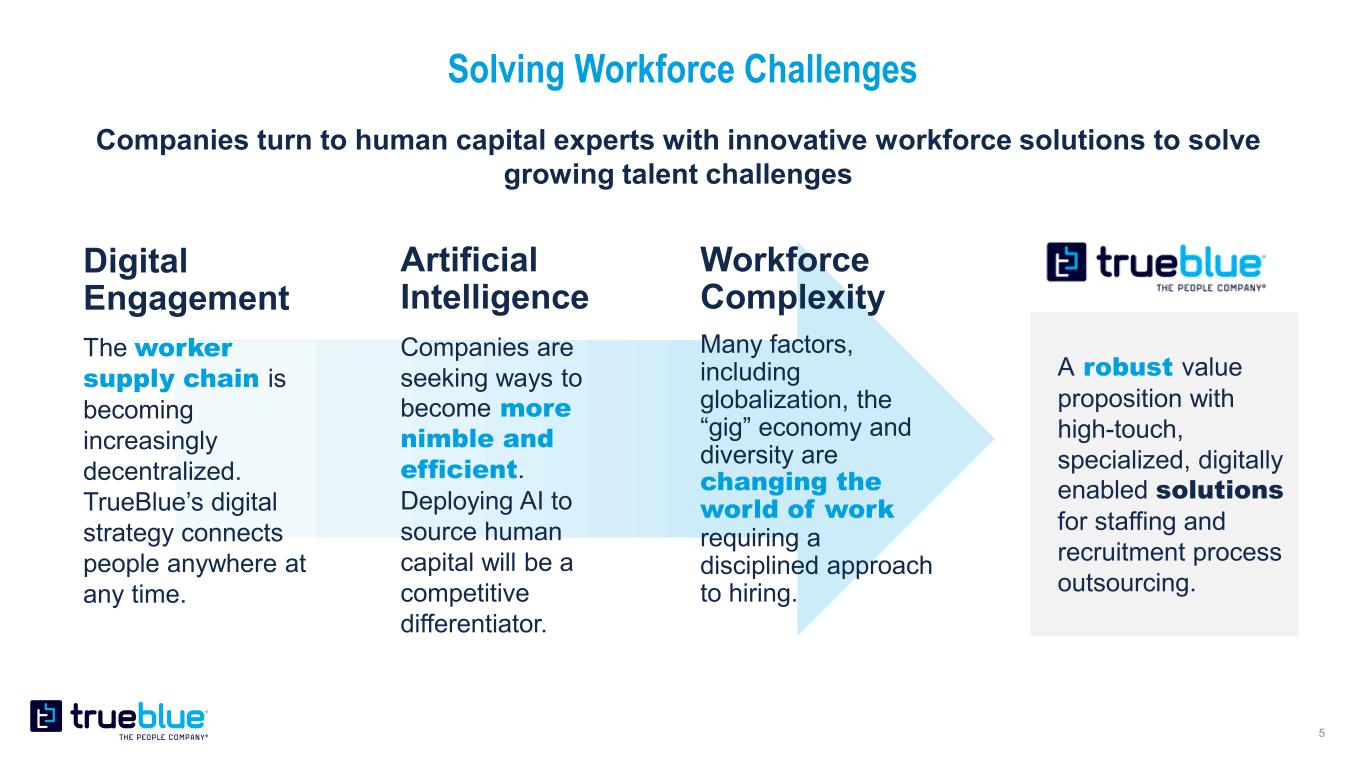 Solving Workforce Challenges Workforce Complexity Many factors, including globalization, the “gig” economy and diversity are changing the world of work requiring a disciplined approach to hiring. Artificial Intelligence Companies are seeking ways to become more nimble and efficient Deploying AI to source human capital will be a competitive differentiator. Digital Engagement The worker supply chain is becoming increasingly decentralized. TrueBlue’s digital strategy connects people anywhere at any time. Companies turn to human capital experts with innovative workforce solutions to solve growing talent challenges A robust value proposition with high-touch, specialized, digitally enabled solutions for staffing and recruitment process outsourcing.