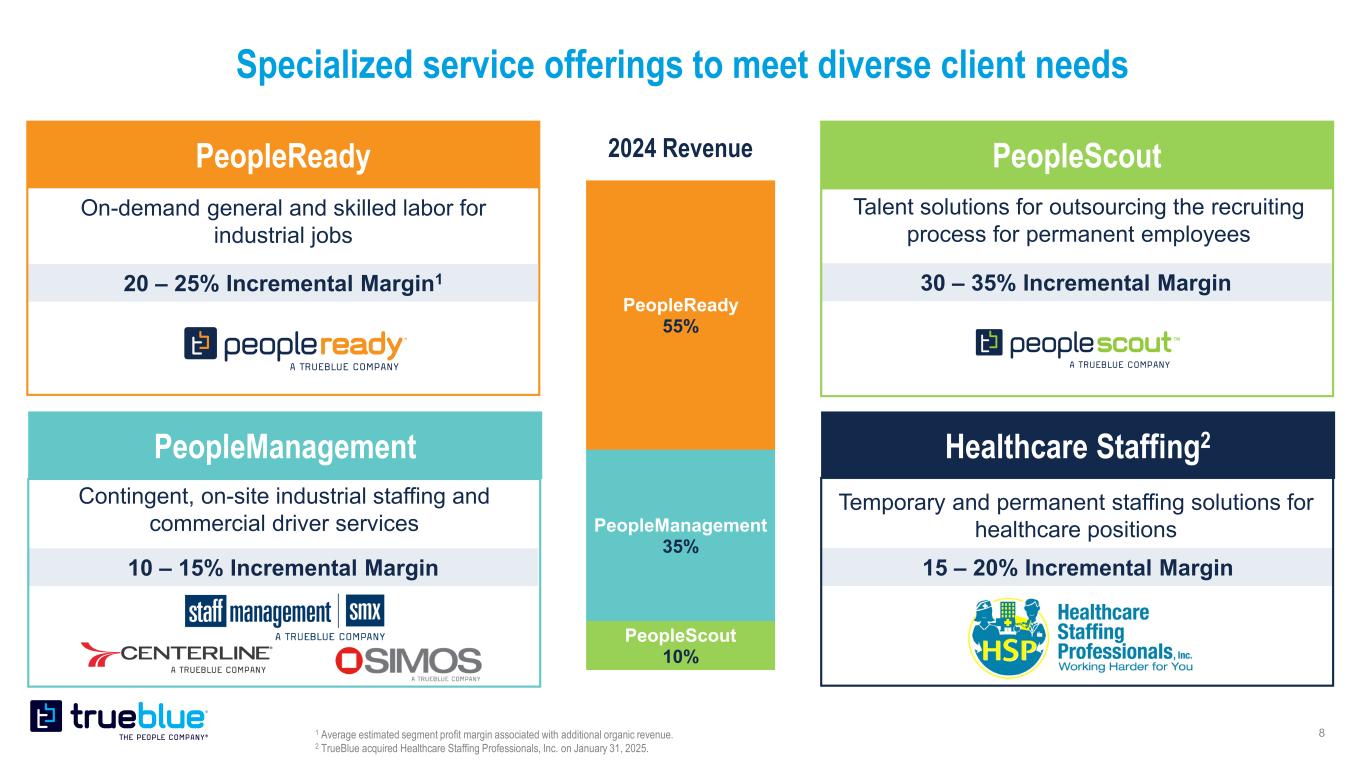 10 – 15% Incremental Margin 15 – 20% Incremental Margin 30 – 35% Incremental Margin Temporary and permanent staffing solutions for healthcare positions Contingent, on-site industrial staffing and commercial driver services On-demand general and skilled labor for industrial jobs Talent solutions for outsourcing the recruiting process for permanent employees Specialized service offerings to meet diverse client needs PeopleReady PeopleManagement Healthcare Staffing2 PeopleScout 10% PeopleManagement 35% PeopleReady 55% 2024 Revenue 1 Average estimated segment profit margin associated with additional organic revenue. 2 TrueBlue acquired Healthcare Staffing Professionals, Inc. on January 31, 2025. PeopleScout 20 – 25% Incremental Margin1