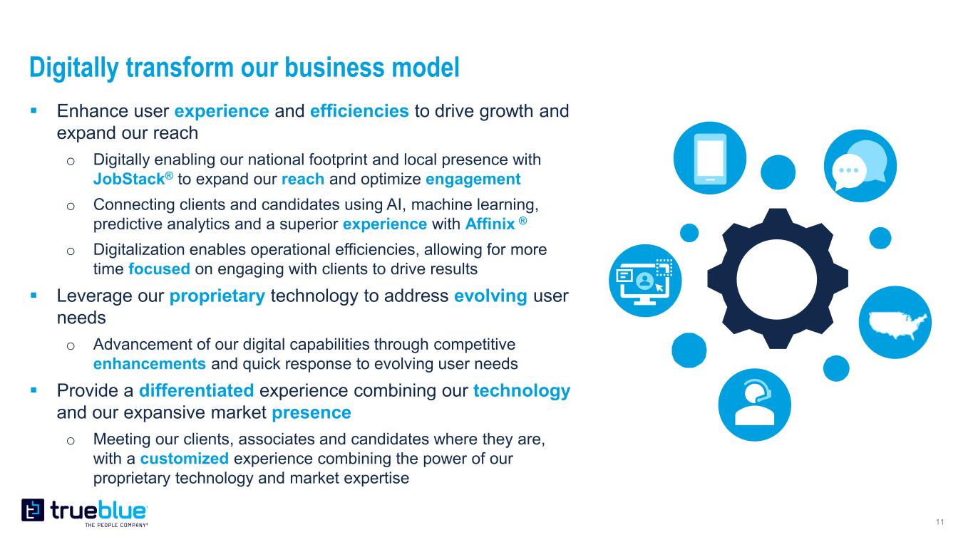 Digitally transform our business model Enhance user experience and efficiencies to drive growth and expand our reach o Digitally enabling our national footprint and local presence with JobStack® to expand our reach and optimize engagement o Connecting clients and candidates using AI, machine learning, predictive analytics and a superior experience with Affinix ® o Digitalization enables operational efficiencies, allowing for more time focused on engaging with clients to drive results Leverage our proprietary technology to address evolving user needs o Advancement of our digital capabilities through competitive enhancements and quick response to evolving user needs Provide a differentiated experience combining our technology and our expansive market presence o Meeting our clients, associates and candidates where they are, with a customized experience combining the power of our proprietary technology and market expertise