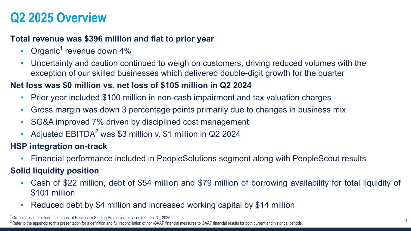 3 Q2 2025 Overview Total revenue was $396 million and flat to prior year ▪ Organic1 revenue down 4% ▪ Uncertainty and caution continued to weigh on customers, driving reduced volumes with the exception of our skilled businesses which delivered double-digit growth for the quarter Net loss was $0 million vs. net loss of $105 million in Q2 2024 ▪ Prior year included $100 million in non-cash impairment and tax valuation charges ▪ Gross margin was down 3 percentage points primarily due to changes in business mix ▪ SG&A improved 7% driven by disciplined cost management ▪ Adjusted EBITDA2 was $3 million v. $1 million in Q2 2024 HSP integration on-track ▪ Financial performance included in PeopleSolutions segment along with PeopleScout results Solid liquidity position ▪ Cash of $22 million, debt of $54 million and $79 million of borrowing availability for total liquidity of $101 million ▪ Reduced debt by $4 million and increased working capital by $14 million 1 Organic results exclude the impact of Healthcare Staffing Professionals, acquired Jan. 31, 2025. 2 Refer to the appendix to this presentation for a definition and full reconciliation of non-GAAP financial measures to GAAP financial results for both current and historical periods.