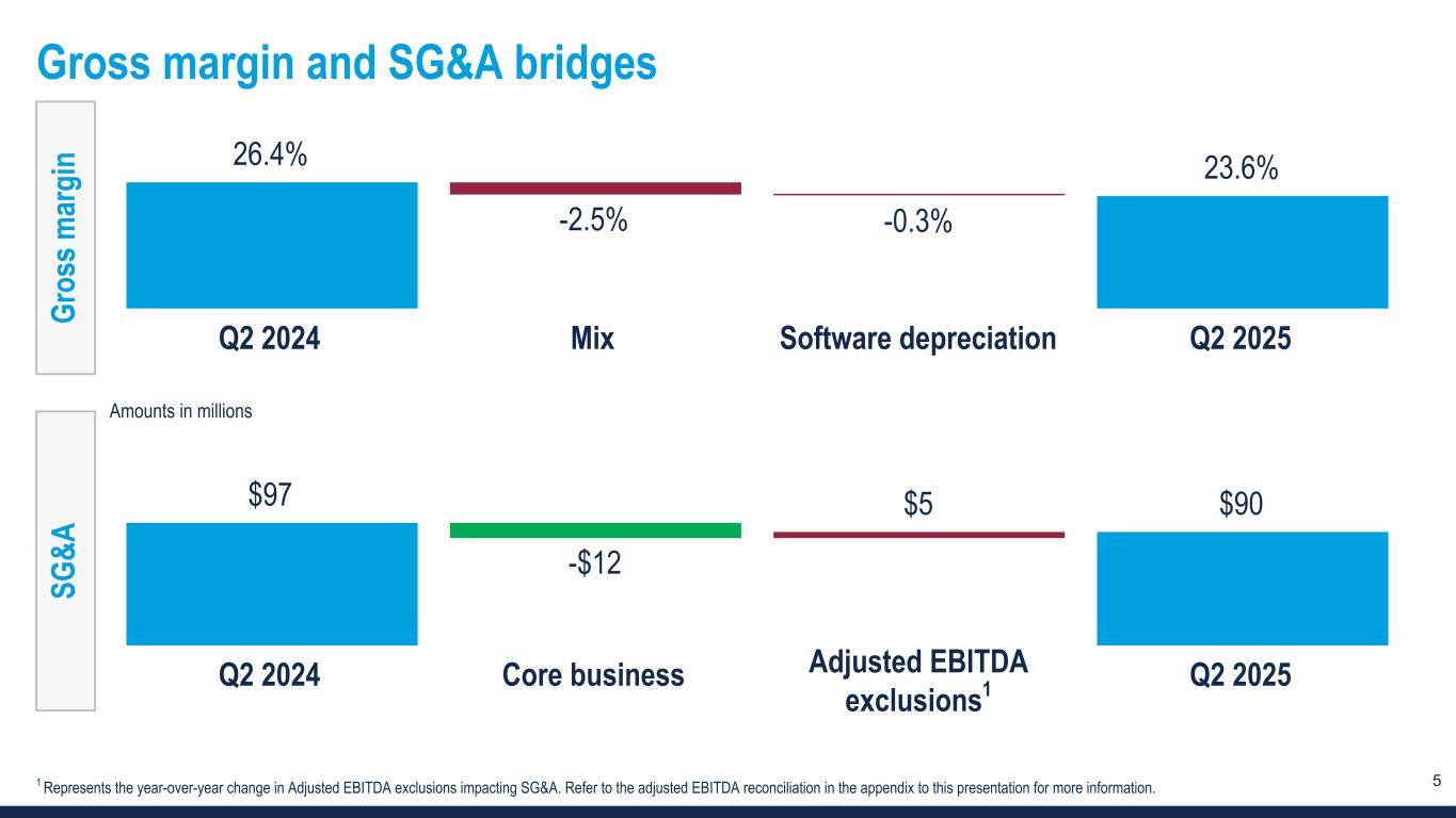 5 Gross margin and SG&A bridges Gr os s m ar gi n 26.4% -2.5% -0.3% 23.6% Q2 2024 Mix Software depreciation Q2 2025 SG &A $97 -$12 $5 $90 Q2 2024 Core business Q2 2025 Amounts in millions 1 Represents the year-over-year change in Adjusted EBITDA exclusions impacting SG&A. Refer to the adjusted EBITDA reconciliation in the appendix to this presentation for more information. Adjusted EBITDA exclusions1