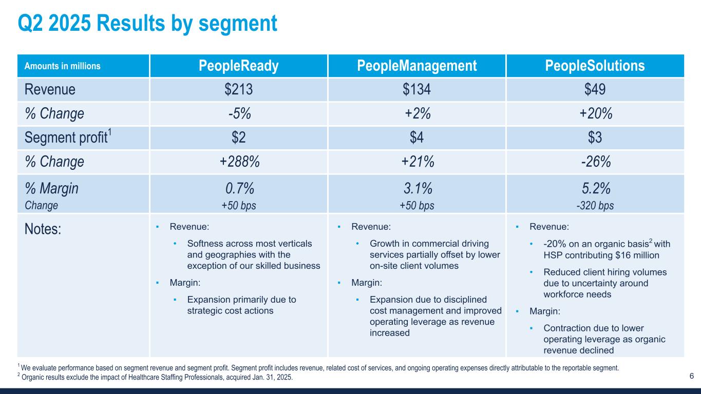 6 Q2 2025 Results by segment Amounts in millions PeopleReady PeopleManagement PeopleSolutions Revenue $213 $134 $49 % Change -5% +2% +20% Segment profit1 $2 $4 $3 % Change +288% +21% -26% % Margin 0.7% 3.1% 5.2% Change +50 bps +50 bps -320 bps Notes: ▪ Revenue: • Softness across most verticals and geographies with the exception of our skilled business ▪ Margin: ▪ Expansion primarily due to strategic cost actions ▪ Revenue: • Growth in commercial driving services partially offset by lower on-site client volumes ▪ Margin: ▪ Expansion due to disciplined cost management and improved operating leverage as revenue increased ▪ Revenue: • -20% on an organic basis2 with HSP contributing $16 million • Reduced client hiring volumes due to uncertainty around workforce needs ▪ Margin: ▪ Contraction due to lower operating leverage as organic revenue declined 1 We evaluate performance based on segment revenue and segment profit. Segment profit includes revenue, related cost of services, and ongoing operating expenses directly attributable to the reportable segment. 2 Organic results exclude the impact of Healthcare Staffing Professionals, acquired Jan. 31, 2025.