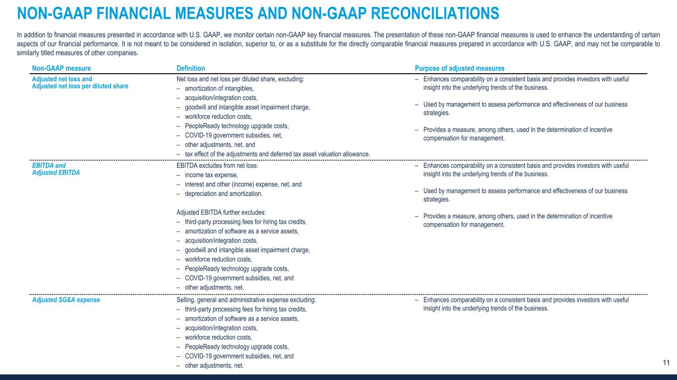 11 NON-GAAP FINANCIAL MEASURES AND NON-GAAP RECONCILIATIONS In addition to financial measures presented in accordance with U.S. GAAP, we monitor certain non-GAAP key financial measures. The presentation of these non-GAAP financial measures is used to enhance the understanding of certain aspects of our financial performance. It is not meant to be considered in isolation, superior to, or as a substitute for the directly comparable financial measures prepared in accordance with U.S. GAAP, and may not be comparable to similarly titled measures of other companies. Non-GAAP measure Definition Purpose of adjusted measures Adjusted net loss and Adjusted net loss per diluted share Net loss and net loss per diluted share, excluding: – amortization of intangibles, – acquisition/integration costs, – goodwill and intangible asset impairment charge, – workforce reduction costs, – PeopleReady technology upgrade costs, – COVID-19 government subsidies, net, – other adjustments, net, and – tax effect of the adjustments and deferred tax asset valuation allowance. – Enhances comparability on a consistent basis and provides investors with useful insight into the underlying trends of the business. – Used by management to assess performance and effectiveness of our business strategies. – Provides a measure, among others, used in the determination of incentive compensation for management. EBITDA and Adjusted EBITDA EBITDA excludes from net loss: – income tax expense, – interest and other (income) expense, net, and – depreciation and amortization. Adjusted EBITDA further excludes: – third-party processing fees for hiring tax credits, – amortization of software as a service assets, – acquisition/integration costs, – goodwill and intangible asset impairment charge, – workforce reduction costs, – PeopleReady technology upgrade costs, – COVID-19 government subsidies, net, and – other adjustments, net. – Enhances comparability on a consistent basis and provides investors with useful insight into the underlying trends of the business. – Used by management to assess performance and effectiveness of our business strategies. – Provides a measure, among others, used in the determination of incentive compensation for management. Adjusted SG&A expense Selling, general and administrative expense excluding: – third-party processing fees for hiring tax credits, – amortization of software as a service assets, – acquisition/integration costs, – workforce reduction costs, – PeopleReady technology upgrade costs, – COVID-19 government subsidies, net, and – other adjustments, net. – Enhances comparability on a consistent basis and provides investors with useful insight into the underlying trends of the business.