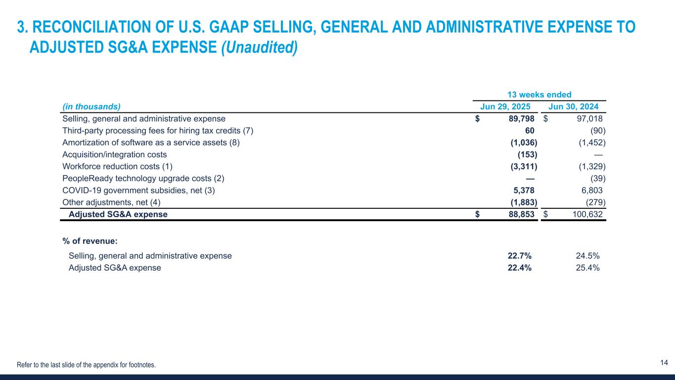 13 2. RECONCILIATION OF U.S. GAAP NET LOSS TO EBITDA AND ADJUSTED EBITDA (Unaudited) Refer to the last slide of the appendix for footnotes. 13 weeks ended (in thousands) Jun 29, 2025 Jun 30, 2024 Net loss $ (160) $ (104,710) Income tax expense 122 46,491 Interest and other (income) expense, net (2,903) (1,741) Depreciation and amortization (6) 7,502 7,691 EBITDA 4,561 (52,269) Third-party processing fees for hiring tax credits (7) (60) 90 Amortization of software as a service assets (8) 1,036 1,452 Acquisition/integration costs 153 — Goodwill and intangible asset impairment charge 200 59,674 Workforce reduction costs (1) 3,445 1,500 PeopleReady technology upgrade costs (2) — 39 COVID-19 government subsidies, net (3) (8,573) (9,696) Other adjustments, net (4) 1,883 279 Adjusted EBITDA $ 2,645 $ 1,069 Margin / % of revenue: Net loss — % (26.4) % Adjusted EBITDA 0.7 % 0.3 %