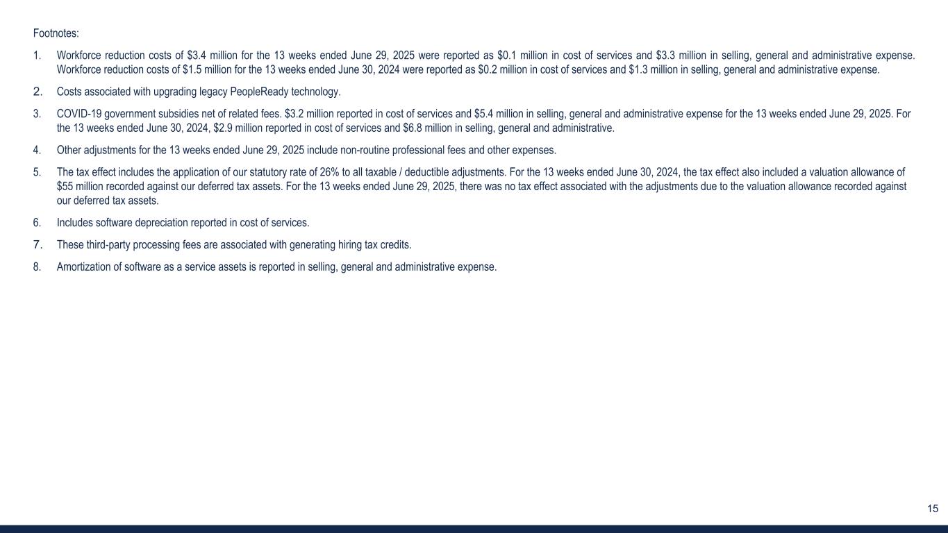 14 3. RECONCILIATION OF U.S. GAAP SELLING, GENERAL AND ADMINISTRATIVE EXPENSE TO ADJUSTED SG&A EXPENSE (Unaudited) Refer to the last slide of the appendix for footnotes. 13 weeks ended (in thousands) Jun 29, 2025 Jun 30, 2024 Selling, general and administrative expense $ 89,798 $ 97,018 Third-party processing fees for hiring tax credits (7) 60 (90) Amortization of software as a service assets (8) (1,036) (1,452) Acquisition/integration costs (153) — Workforce reduction costs (1) (3,311) (1,329) PeopleReady technology upgrade costs (2) — (39) COVID-19 government subsidies, net (3) 5,378 6,803 Other adjustments, net (4) (1,883) (279) Adjusted SG&A expense $ 88,853 $ 100,632 % of revenue: Selling, general and administrative expense 22.7 % 24.5 % Adjusted SG&A expense 22.4 % 25.4 %