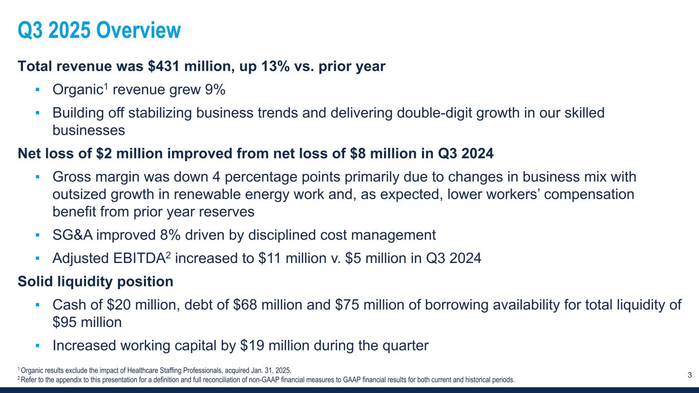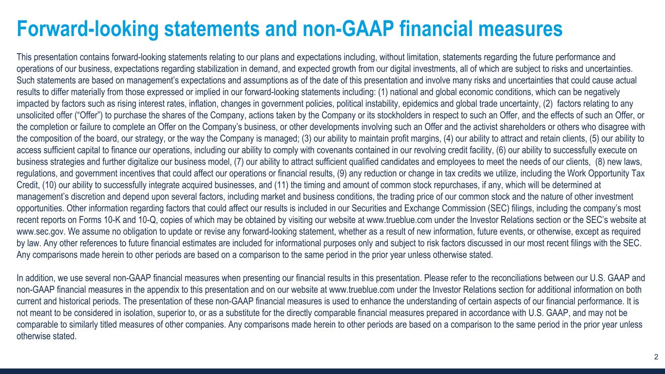 2 Forward-looking statements and non-GAAP financial measures This presentation contains forward-looking statements relating to our plans and expectations including, without limitation, statements regarding the future performance and operations of our business, expectations regarding stabilization in demand, and expected growth from our digital investments, all of which are subject to risks and uncertainties. Such statements are based on management’s expectations and assumptions as of the date of this presentation and involve many risks and uncertainties that could cause actual results to differ materially from those expressed or implied in our forward-looking statements including: (1) national and global economic conditions, which can be negatively impacted by factors such as rising interest rates, inflation, changes in government policies, political instability, epidemics and global trade uncertainty, (2) factors relating to any unsolicited offer (“Offer”) to purchase the shares of the Company, actions taken by the Company or its stockholders in respect to such an Offer, and the effects of such an Offer, or the completion or failure to complete an Offer on the Company’s business, or other developments involving such an Offer and the activist shareholders or others who disagree with the composition of the board, our strategy, or the way the Company is managed; (3) our ability to maintain profit margins, (4) our ability to attract and retain clients, (5) our ability to access sufficient capital to finance our operations, including our ability to comply with covenants contained in our revolving credit facility, (6) our ability to successfully execute on business strategies and further digitalize our business model, (7) our ability to attract sufficient qualified candidates and employees to meet the needs of our clients, (8) new laws, regulations, and government incentives that could affect our operations or financial results, (9) any reduction or change in tax credits we utilize, including the Work Opportunity Tax Credit, (10) our ability to successfully integrate acquired businesses, and (11) the timing and amount of common stock repurchases, if any, which will be determined at management’s discretion and depend upon several factors, including market and business conditions, the trading price of our common stock and the nature of other investment opportunities. Other information regarding factors that could affect our results is included in our Securities and Exchange Commission (SEC) filings, including the company’s most recent reports on Forms 10-K and 10-Q, copies of which may be obtained by visiting our website at www.trueblue.com under the Investor Relations section or the SEC’s website at www.sec.gov. We assume no obligation to update or revise any forward-looking statement, whether as a result of new information, future events, or otherwise, except as required by law. Any other references to future financial estimates are included for informational purposes only and subject to risk factors discussed in our most recent filings with the SEC. Any comparisons made herein to other periods are based on a comparison to the same period in the prior year unless otherwise stated. In addition, we use several non-GAAP financial measures when presenting our financial results in this presentation. Please refer to the reconciliations between our U.S. GAAP and non-GAAP financial measures in the appendix to this presentation and on our website at www.trueblue.com under the Investor Relations section for additional information on both current and historical periods. The presentation of these non-GAAP financial measures is used to enhance the understanding of certain aspects of our financial performance. It is not meant to be considered in isolation, superior to, or as a substitute for the directly comparable financial measures prepared in accordance with U.S. GAAP, and may not be comparable to similarly titled measures of other companies. Any comparisons made herein to other periods are based on a comparison to the same period in the prior year unless otherwise stated.
