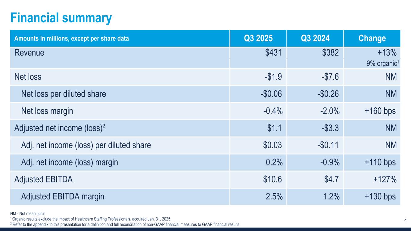3 Q3 2025 Overview Total revenue was $431 million, up 13% vs. prior year ▪ Organic1 revenue grew 9% ▪ Building off stabilizing business trends and delivering double-digit growth in our skilled businesses Net loss of $2 million improved from net loss of $8 million in Q3 2024 ▪ Gross margin was down 4 percentage points primarily due to changes in business mix with outsized growth in renewable energy work and, as expected, lower workers’ compensation benefit from prior year reserves ▪ SG&A improved 8% driven by disciplined cost management ▪ Adjusted EBITDA2 increased to $11 million v. $5 million in Q3 2024 Solid liquidity position ▪ Cash of $20 million, debt of $68 million and $75 million of borrowing availability for total liquidity of $95 million ▪ Increased working capital by $19 million during the quarter 1 Organic results exclude the impact of Healthcare Staffing Professionals, acquired Jan. 31, 2025. 2 Refer to the appendix to this presentation for a definition and full reconciliation of non-GAAP financial measures to GAAP financial results for both current and historical periods.