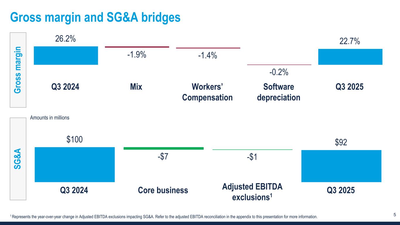 4 Financial summary Amounts in millions, except per share data Q3 2025 Q3 2024 Change Revenue $431 $382 +13 % 9% organic1 Net loss -$1.9 -$7.6 NM Net loss per diluted share -$0.06 -$0.26 NM Net loss margin -0.4 % -2.0 % +160 bps Adjusted net income (loss)2 $1.1 -$3.3 NM Adj. net income (loss) per diluted share $0.03 -$0.11 NM Adj. net income (loss) margin 0.2 % -0.9 % +110 bps Adjusted EBITDA $10.6 $4.7 +127 % Adjusted EBITDA margin 2.5 % 1.2 % +130 bps NM - Not meaningful 1 Organic results exclude the impact of Healthcare Staffing Professionals, acquired Jan. 31, 2025. 2 Refer to the appendix to this presentation for a definition and full reconciliation of non-GAAP financial measures to GAAP financial results.
