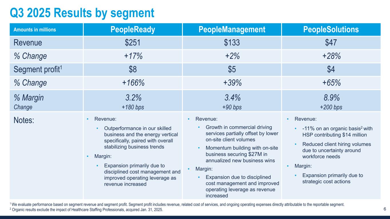15 Footnotes: 1. Workforce reduction costs of $0.5 million for the 13 weeks ended September 28, 2025 were reported as $0.1 million in cost of services and $0.4 million in selling, general and administrative expense. Workforce reduction costs of $2.8 million for the 13 weeks ended September 29, 2024 were reported as $0.2 million in cost of services and $2.6 million in selling, general and administrative expense. 2. Costs associated with upgrading legacy PeopleReady technology. 3. Other adjustments for the 13 weeks ended September 28, 2025 include non-routine professional fees and other expenses. 4. The tax effect includes the application of our statutory rate of 26% to all taxable / deductible adjustments. For the 13 weeks ended September 28, 2025 and September 29, 2024, there was no tax effect associated with the adjustments due to the valuation allowance recorded against our deferred tax assets. For the 13 weeks ended September 29, 2024, a valuation allowance of $0.6 million was recorded against our foreign deferred tax assets. 5. Includes software depreciation reported in cost of services. 6. These third-party processing fees are associated with generating hiring tax credits. 7. Amortization of software as a service assets is reported in selling, general and administrative expense.