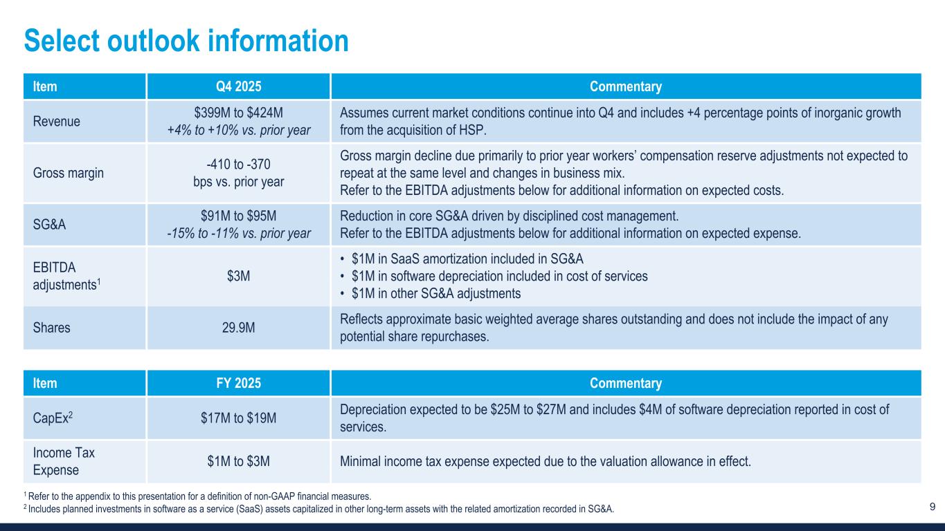 9 Select outlook information Item Q4 2025 Commentary Revenue $399M to $424M +4% to +10% vs. prior year Assumes current market conditions continue into Q4 and includes +4 percentage points of inorganic growth from the acquisition of HSP. Gross margin -410 to -370 bps vs. prior year Gross margin decline due primarily to prior year workers’ compensation reserve adjustments not expected to repeat at the same level and changes in business mix. Refer to the EBITDA adjustments below for additional information on expected costs. SG&A $91M to $95M -15% to -11% vs. prior year Reduction in core SG&A driven by disciplined cost management. Refer to the EBITDA adjustments below for additional information on expected expense. EBITDA adjustments1 $3M • $1M in SaaS amortization included in SG&A • $1M in software depreciation included in cost of services • $1M in other SG&A adjustments Shares 29.9M Reflects approximate basic weighted average shares outstanding and does not include the impact of any potential share repurchases. Item FY 2025 Commentary CapEx2 $17M to $19M Depreciation expected to be $25M to $27M and includes $4M of software depreciation reported in cost of services. Income Tax Expense $1M to $3M Minimal income tax expense expected due to the valuation allowance in effect. 1 Refer to the appendix to this presentation for a definition of non-GAAP financial measures. 2 Includes planned investments in software as a service (SaaS) assets capitalized in other long-term assets with the related amortization recorded in SG&A.