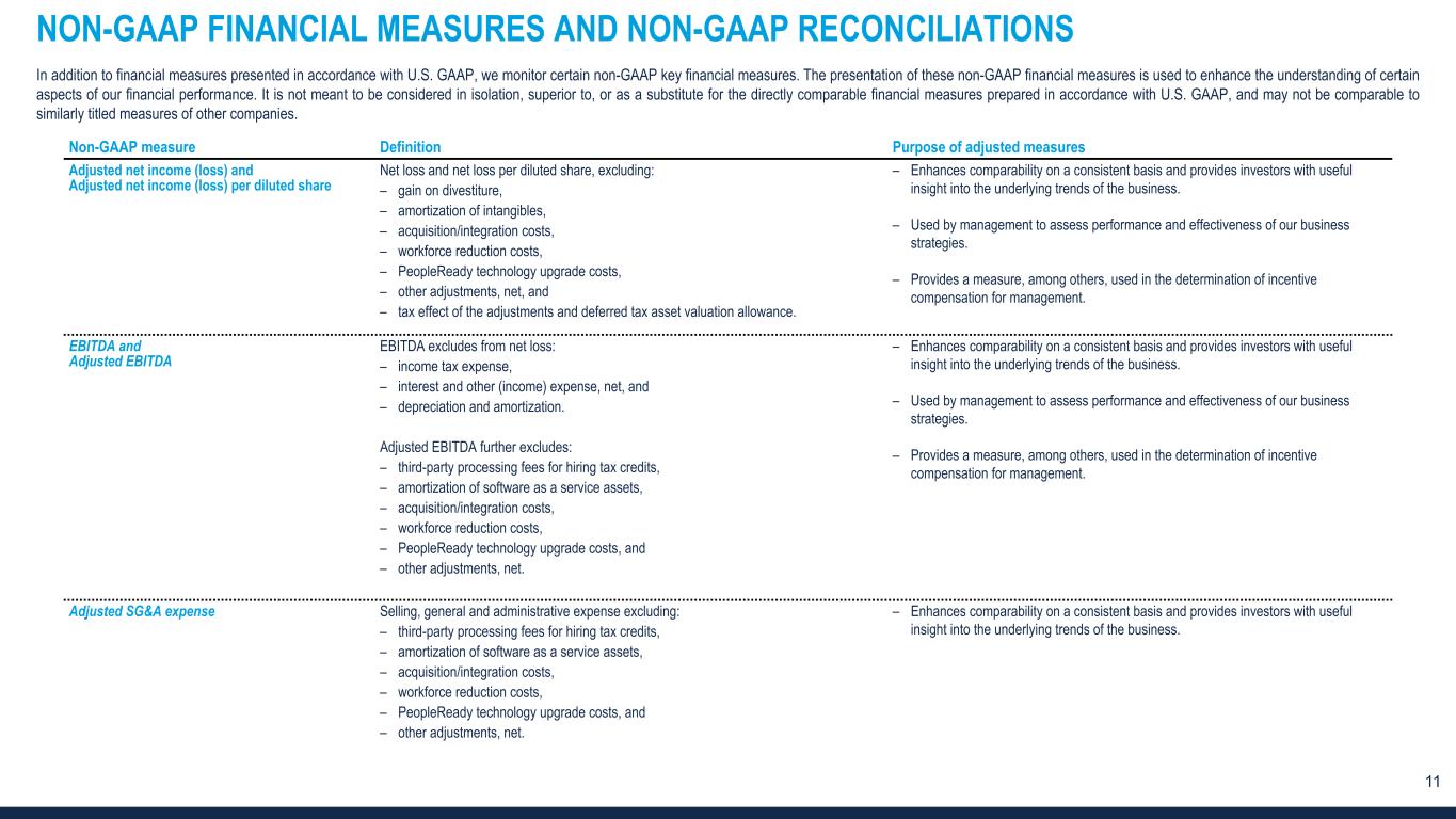 11 NON-GAAP FINANCIAL MEASURES AND NON-GAAP RECONCILIATIONS In addition to financial measures presented in accordance with U.S. GAAP, we monitor certain non-GAAP key financial measures. The presentation of these non-GAAP financial measures is used to enhance the understanding of certain aspects of our financial performance. It is not meant to be considered in isolation, superior to, or as a substitute for the directly comparable financial measures prepared in accordance with U.S. GAAP, and may not be comparable to similarly titled measures of other companies. Non-GAAP measure Definition Purpose of adjusted measures Adjusted net income (loss) and Adjusted net income (loss) per diluted share Net loss and net loss per diluted share, excluding: – gain on divestiture, – amortization of intangibles, – acquisition/integration costs, – workforce reduction costs, – PeopleReady technology upgrade costs, – other adjustments, net, and – tax effect of the adjustments and deferred tax asset valuation allowance. – Enhances comparability on a consistent basis and provides investors with useful insight into the underlying trends of the business. – Used by management to assess performance and effectiveness of our business strategies. – Provides a measure, among others, used in the determination of incentive compensation for management. EBITDA and Adjusted EBITDA EBITDA excludes from net loss: – income tax expense, – interest and other (income) expense, net, and – depreciation and amortization. Adjusted EBITDA further excludes: – third-party processing fees for hiring tax credits, – amortization of software as a service assets, – acquisition/integration costs, – workforce reduction costs, – PeopleReady technology upgrade costs, and – other adjustments, net. – Enhances comparability on a consistent basis and provides investors with useful insight into the underlying trends of the business. – Used by management to assess performance and effectiveness of our business strategies. – Provides a measure, among others, used in the determination of incentive compensation for management. Adjusted SG&A expense Selling, general and administrative expense excluding: – third-party processing fees for hiring tax credits, – amortization of software as a service assets, – acquisition/integration costs, – workforce reduction costs, – PeopleReady technology upgrade costs, and – other adjustments, net. – Enhances comparability on a consistent basis and provides investors with useful insight into the underlying trends of the business.