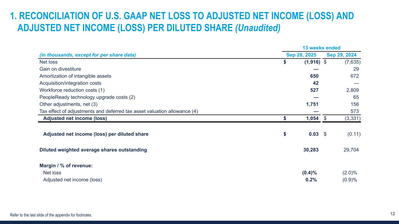 12 1. RECONCILIATION OF U.S. GAAP NET LOSS TO ADJUSTED NET INCOME (LOSS) AND ADJUSTED NET INCOME (LOSS) PER DILUTED SHARE (Unaudited) 13 weeks ended (in thousands, except for per share data) Sep 28, 2025 Sep 29, 2024 Net loss $ (1,916) $ (7,635) Gain on divestiture — 29 Amortization of intangible assets 650 672 Acquisition/integration costs 42 — Workforce reduction costs (1) 527 2,809 PeopleReady technology upgrade costs (2) — 65 Other adjustments, net (3) 1,751 156 Tax effect of adjustments and deferred tax asset valuation allowance (4) — 573 Adjusted net income (loss) $ 1,054 $ (3,331) Adjusted net income (loss) per diluted share $ 0.03 $ (0.11) Diluted weighted average shares outstanding 30,283 29,704 Margin / % of revenue: Net loss (0.4) % (2.0) % Adjusted net income (loss) 0.2 % (0.9) % Refer to the last slide of the appendix for footnotes.